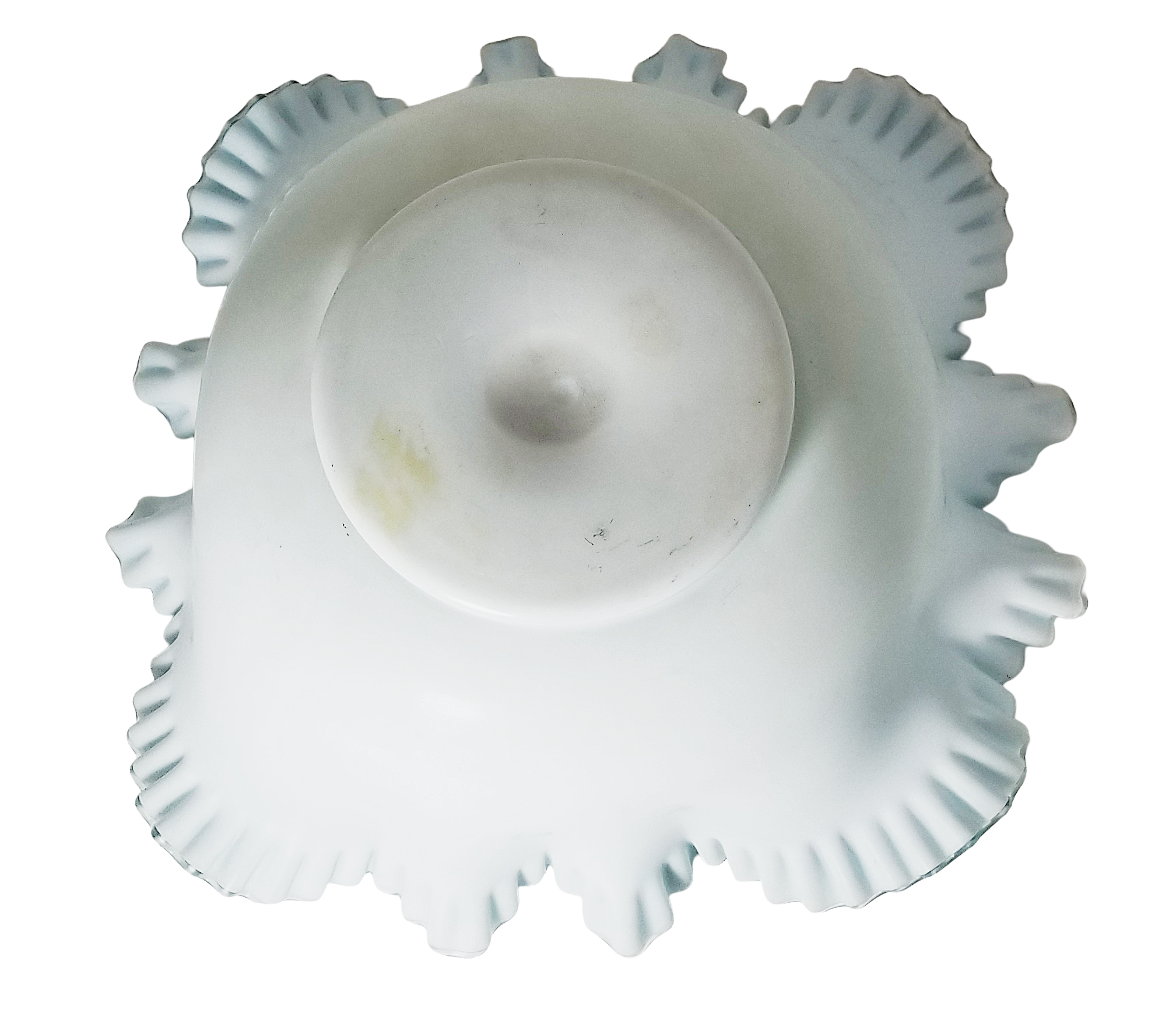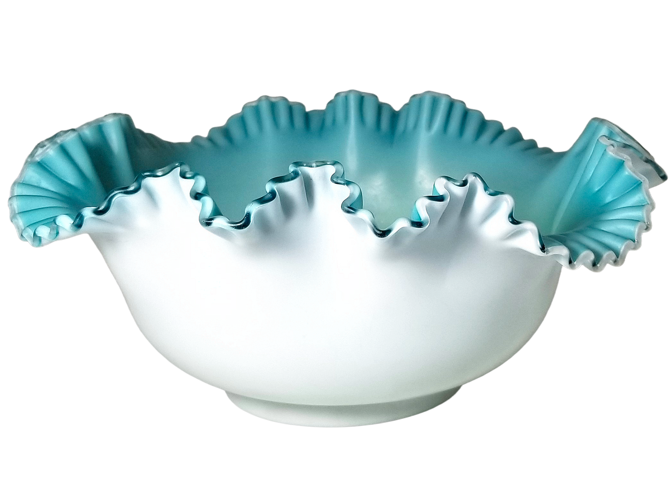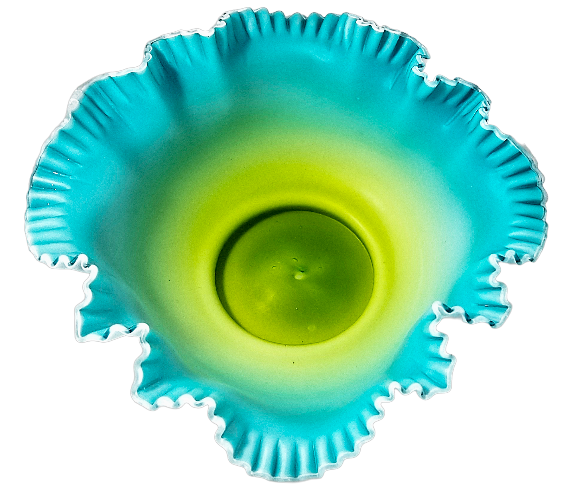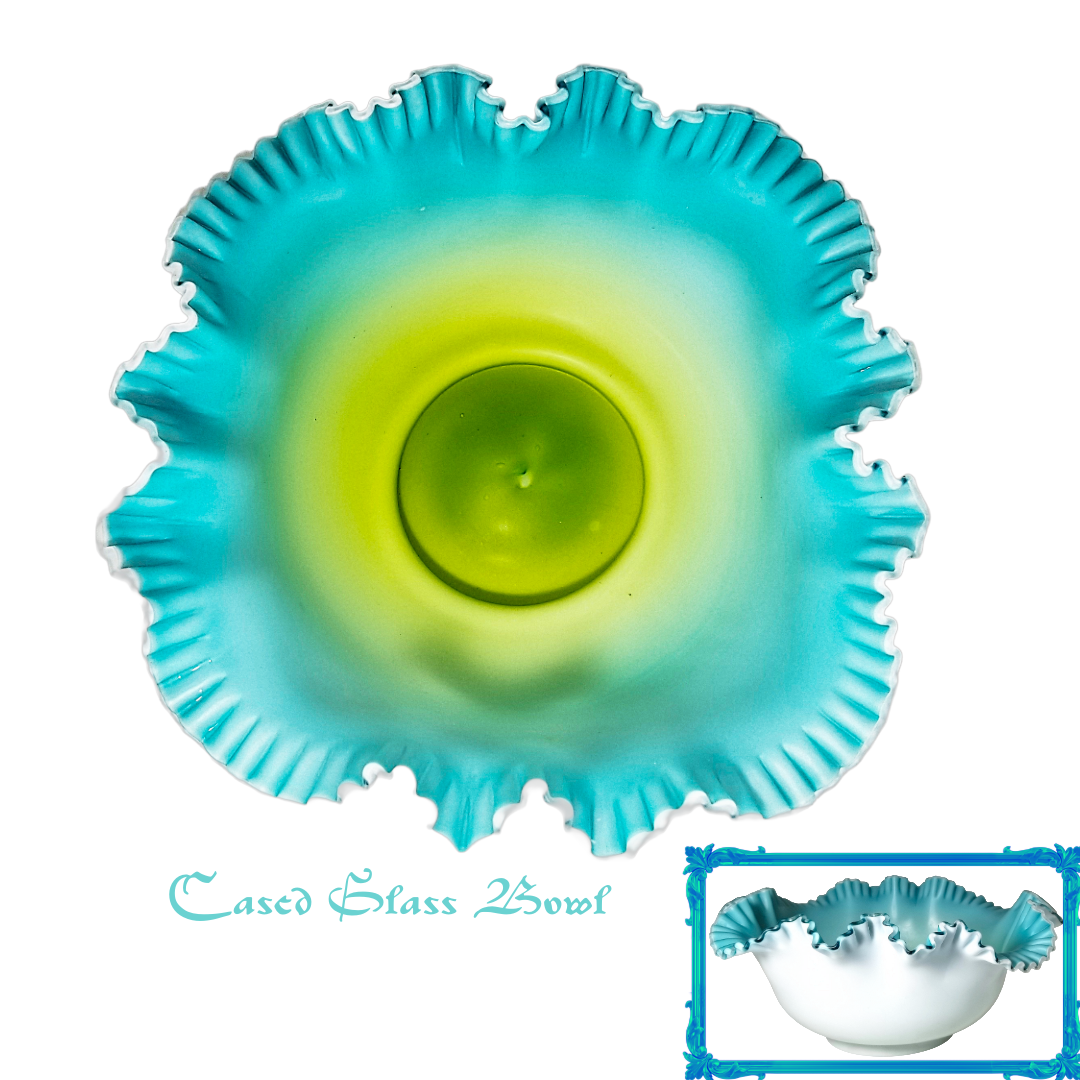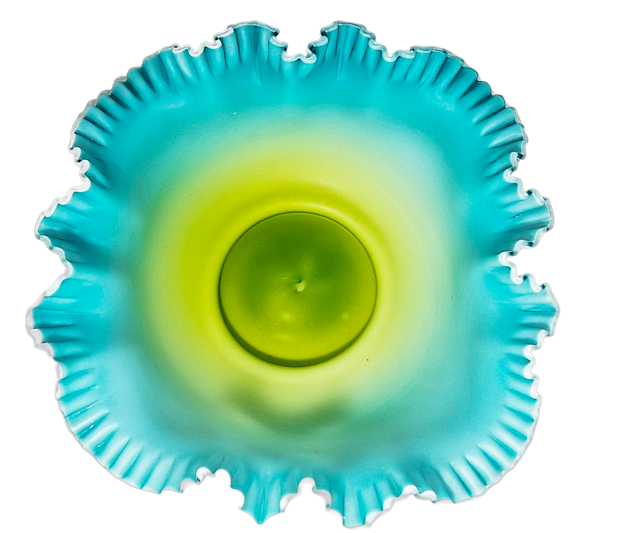 This exquisite larger sized Victorian bride's basket showcases the artistry of the 1880-1910 era with its distinctive cased glass construction. The piece features a charming crimped rim reminiscent of delicate pie crust edging, while the creamy satin finish creates a soft, inviting tactile quality. The color palette is truly captivating—a pristine white exterior contrasts beautifully with an interior that transitions from rich teal blue through verdant green to warm yellow tones at the base. A stunning example of period glasswork that brings timeless elegance and authentic vintage character to any collection.