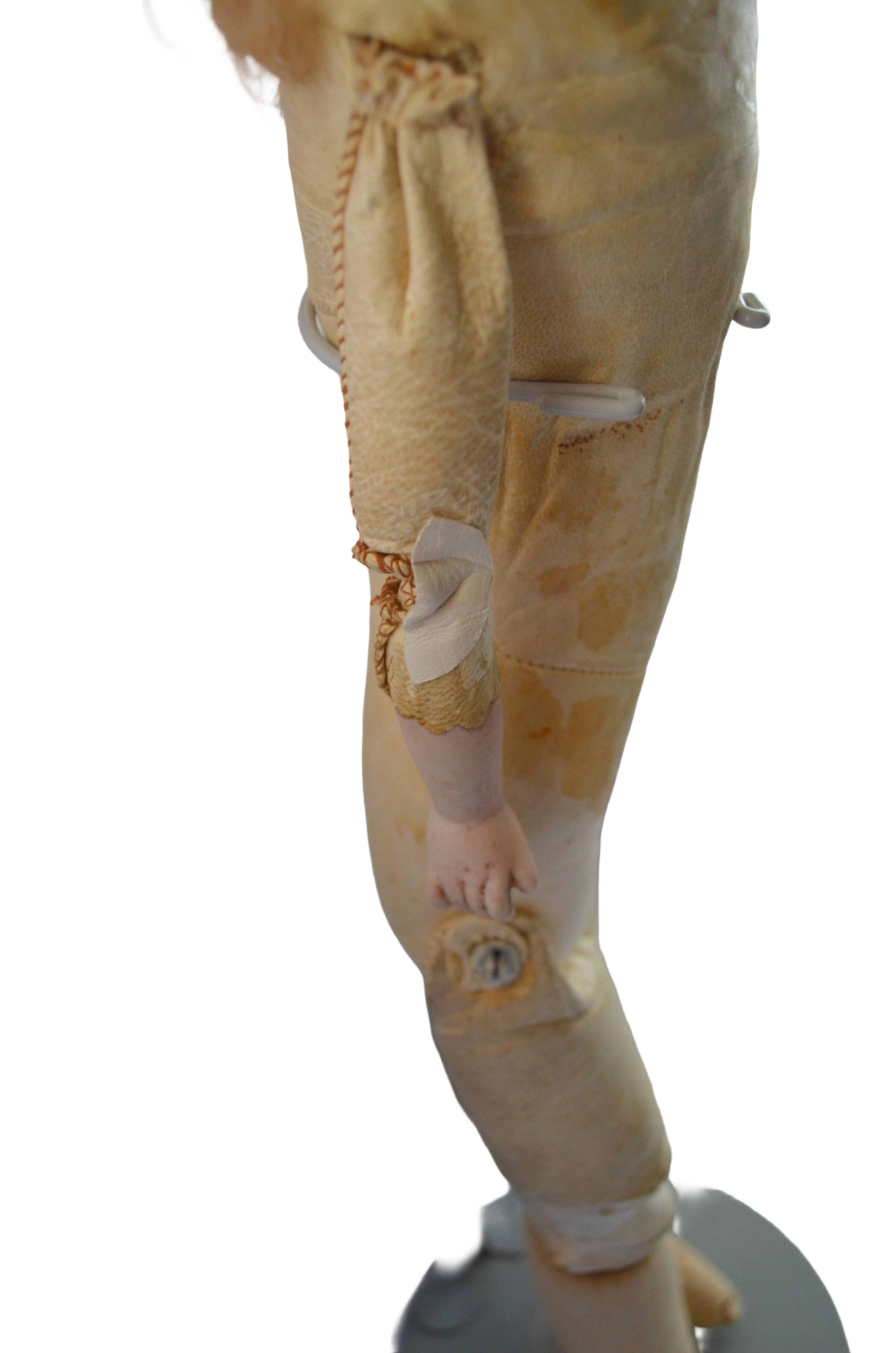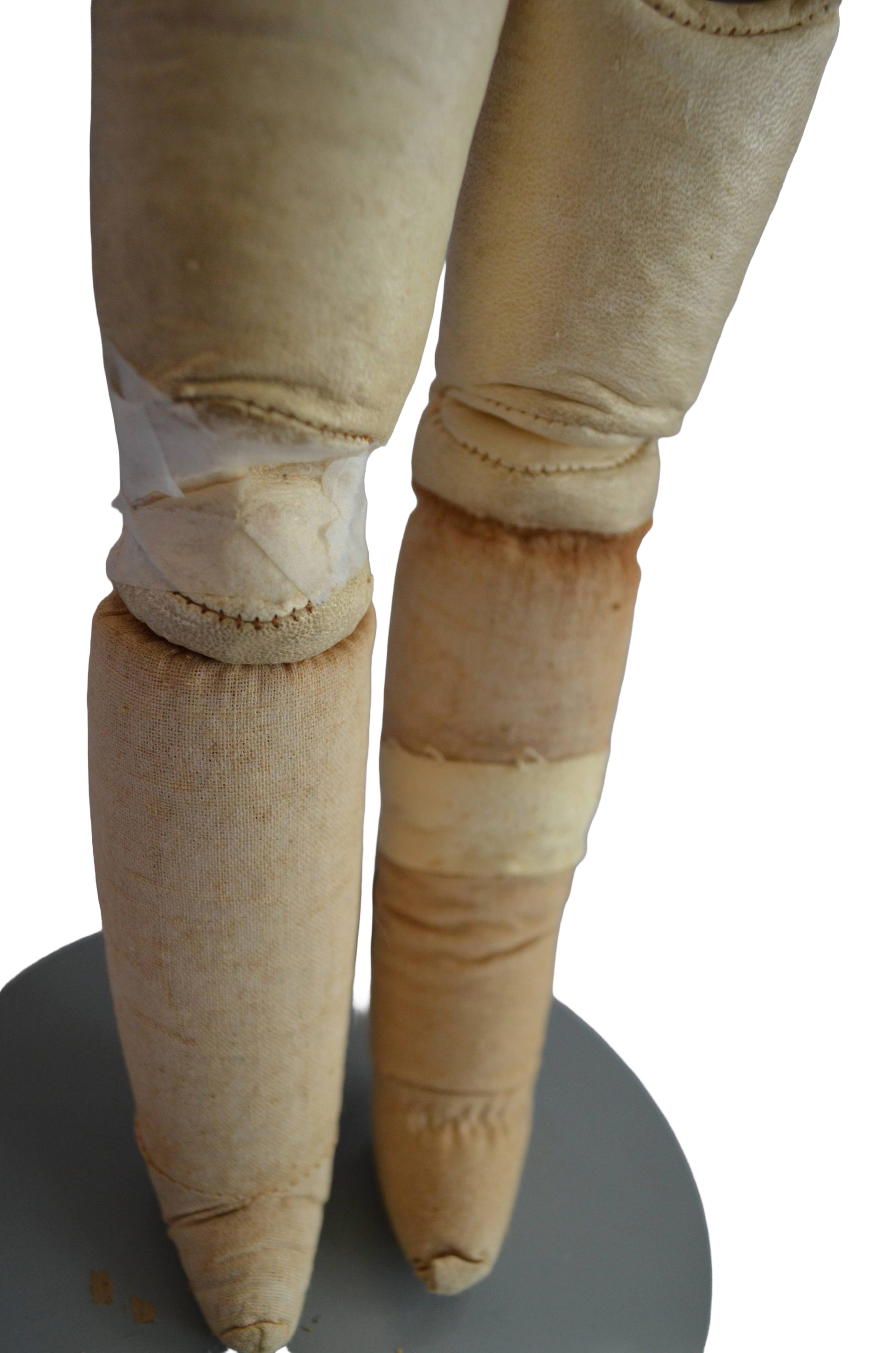 Doll is in overall Very Good Condition, Bisque head is free from cracks, chips and repairs, her eyes have some paint chipping on the lids when closed and could be adjusted slightly to fit better into the sockets, if you look at the images you can see there is a very slight gap there where they have come a little out over time. She has some old glue residue at the temples and around the scalp edges where her wig was affixed to her head, wig appears original as does the leather kid body and bisque hands. Her body has two old taped repairs at the joint seam, one on her arm at the elbow and one her leg at the knee, images are provided and more are available.