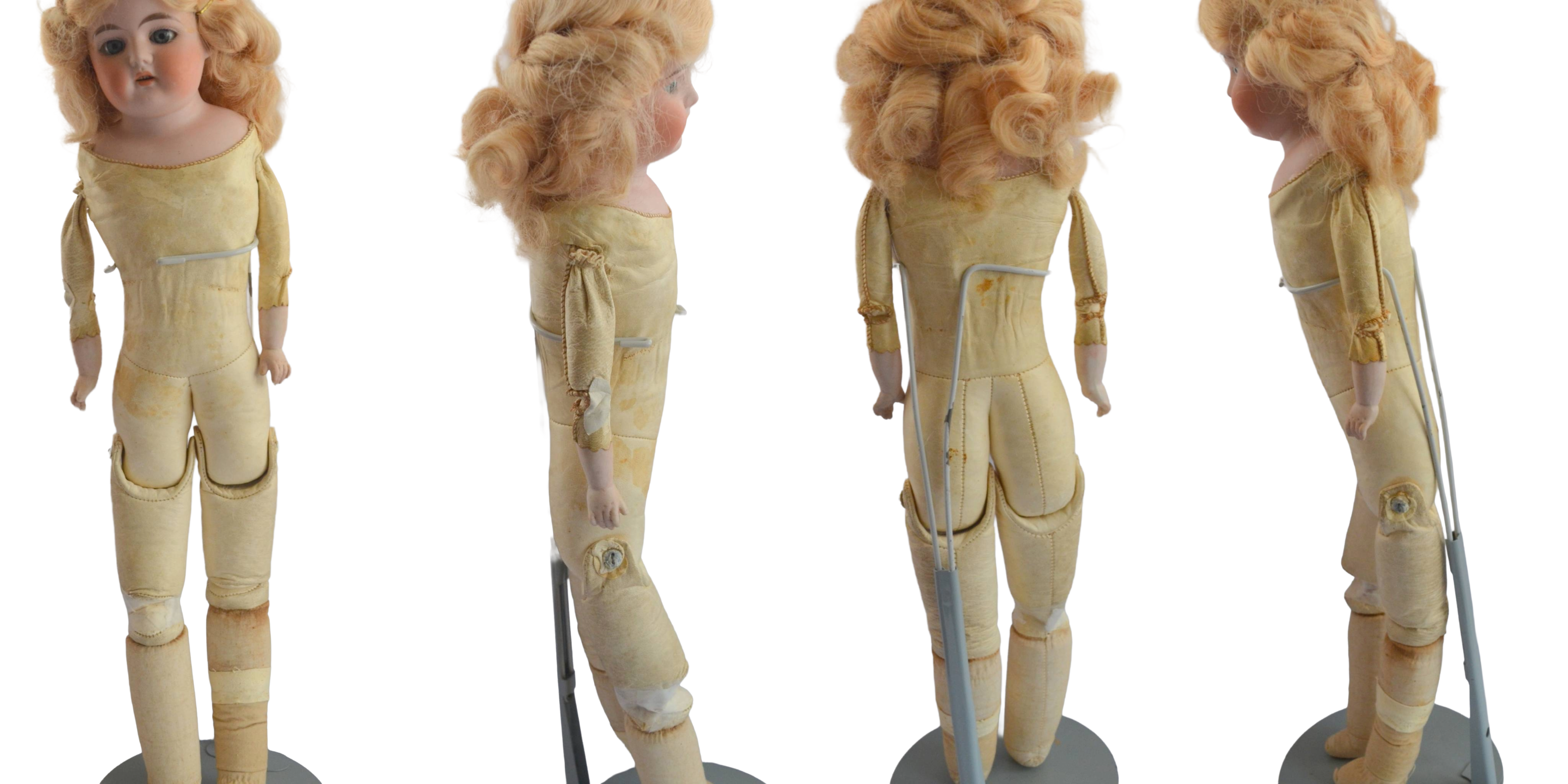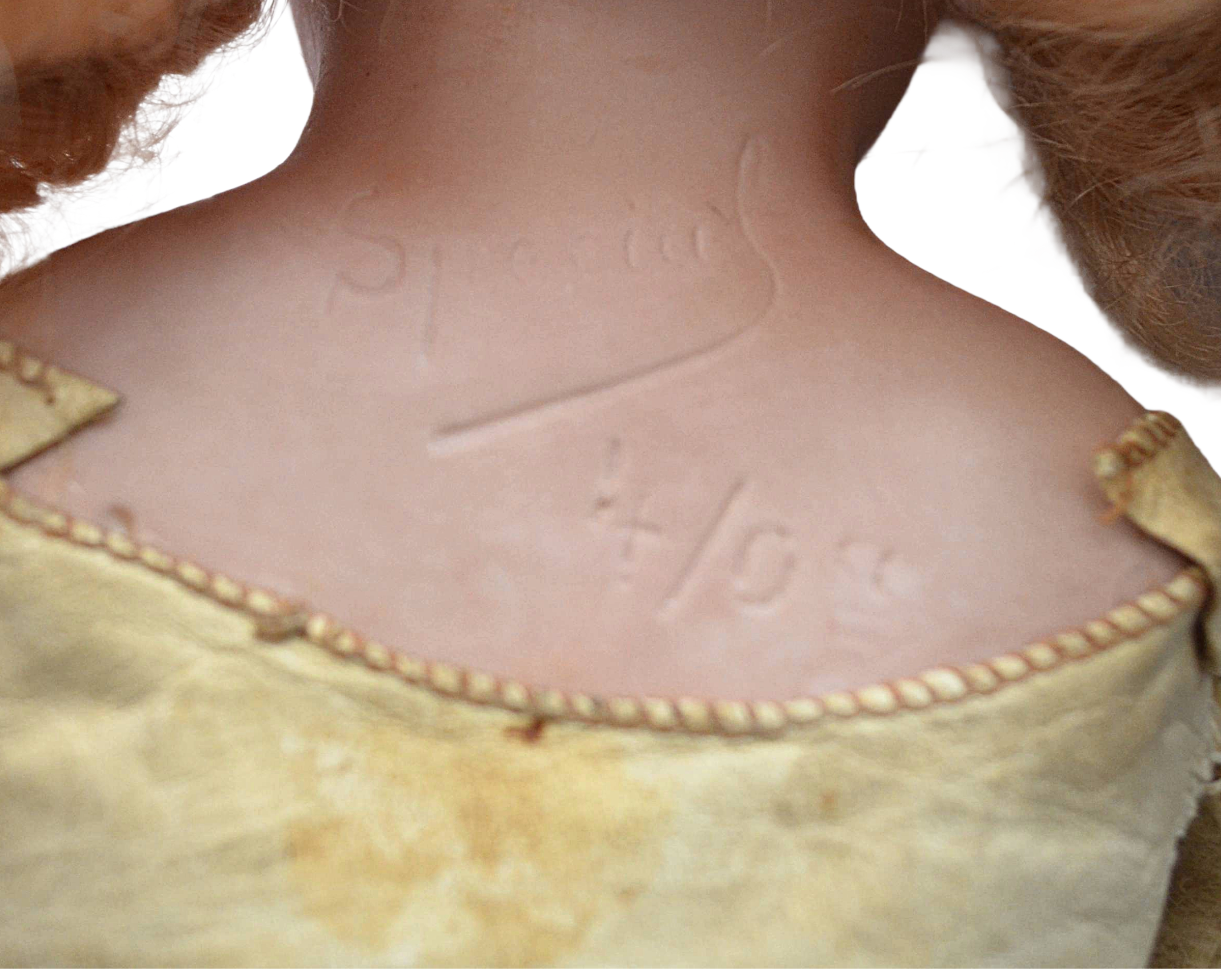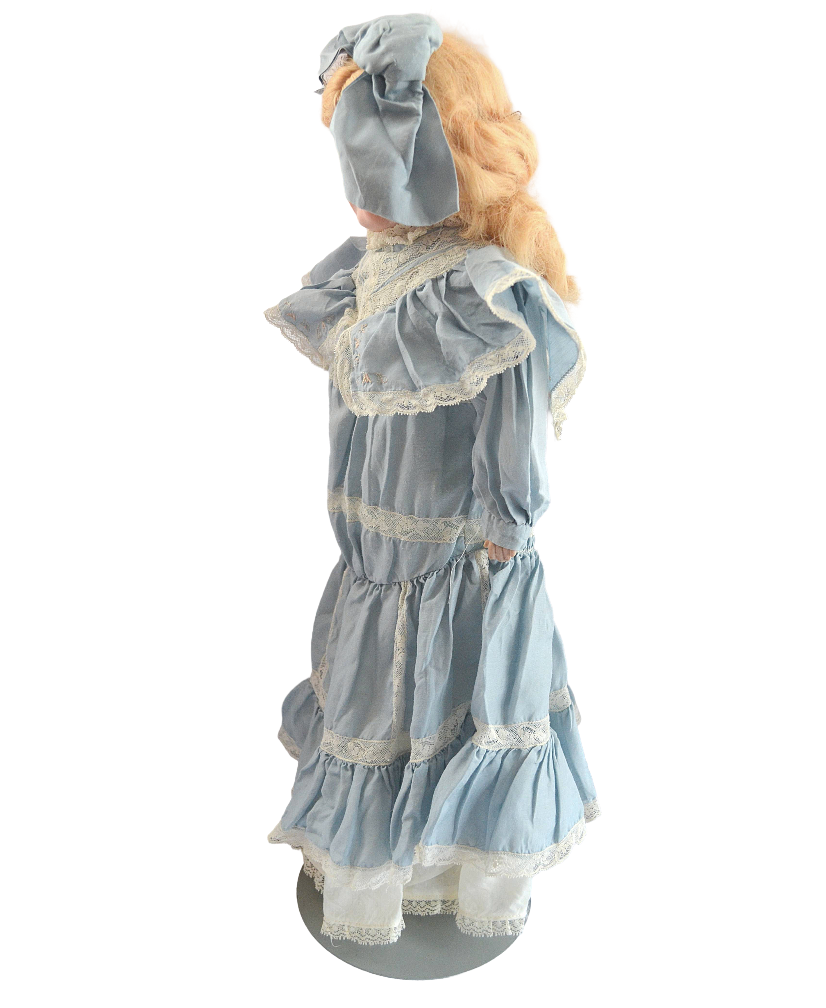 This charming German bisque doll stands 20 inches tall and showcases exceptional craftsmanship with her delicate porcelain head, piercing blue sleep eyes, and soft blonde mohair wig. Her leather kid body is complemented by bisque hands, creating an authentic vintage aesthetic. The doll arrives dressed in an elegant blue vintage gown paired with coordinating ribbon and boots. Marked "Special" at the back of her neck, she's a wonderful addition to any collection and displays beautifully as a cherished heirloom piece.