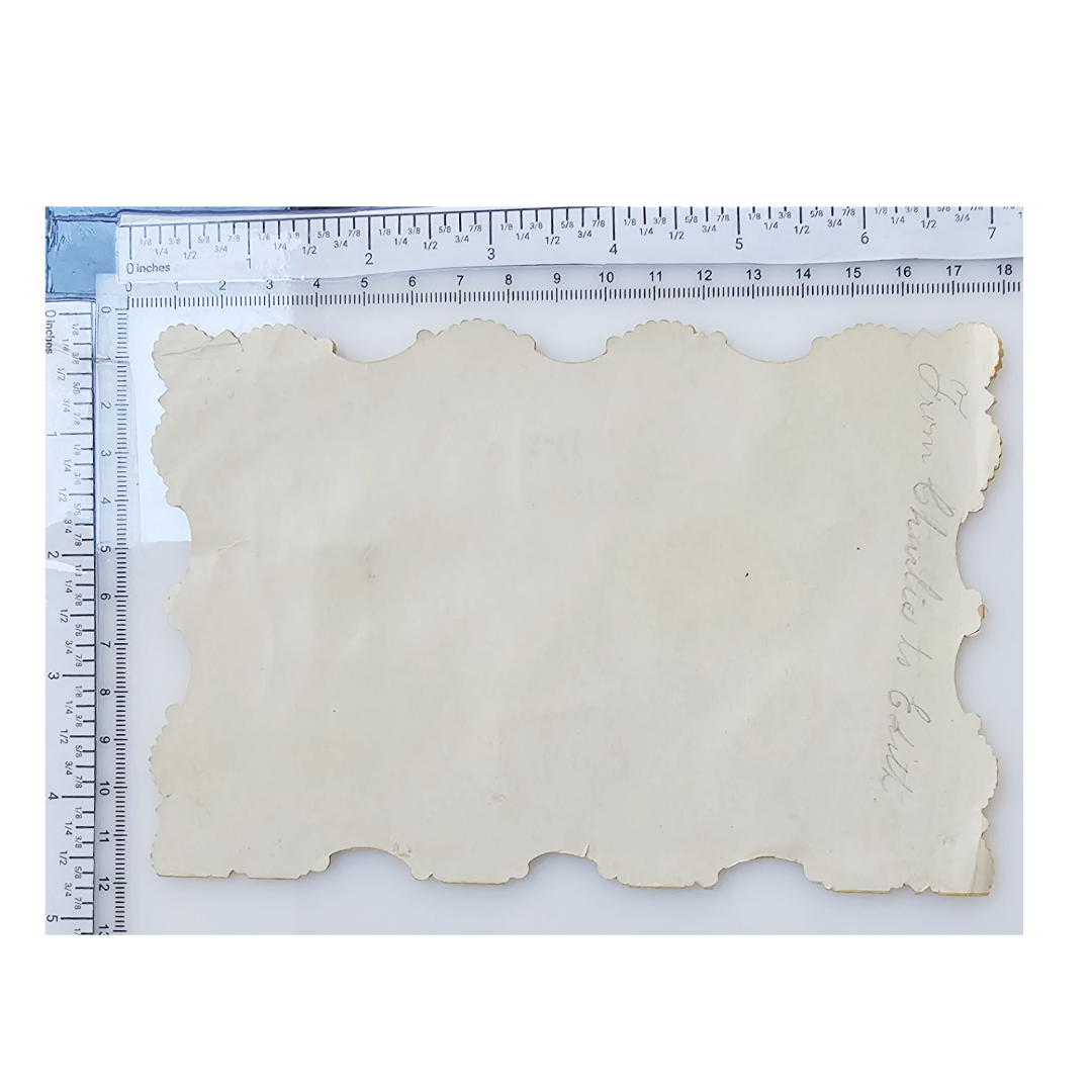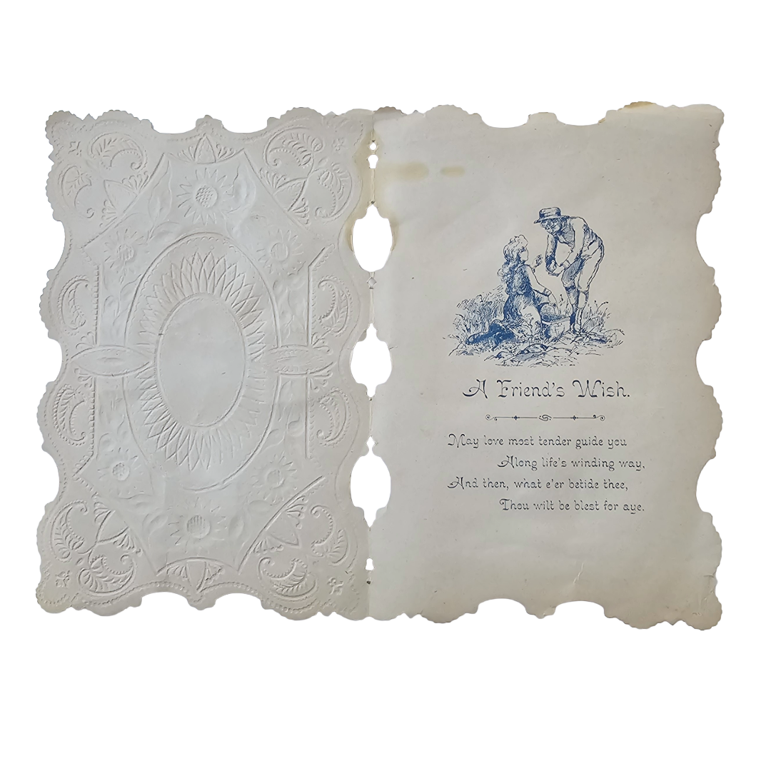 Step back in time with this stunning German Valentine's card from the 1890s-1905 era. Featuring intricate die-cut work and shimmering silver foil embossing, this romantic keepsake showcases a brunette woman set against a serene winter landscape. Delicate pink flowers cascade along the top, while ornate lace-like detailing frames the composition in gleaming silver. A magnificent example of the artistry and sentimentality that defined vintage Valentine's Day greetings. Ideal for serious collectors of antique ephemera and lovers of Victorian-era craftsmanship.