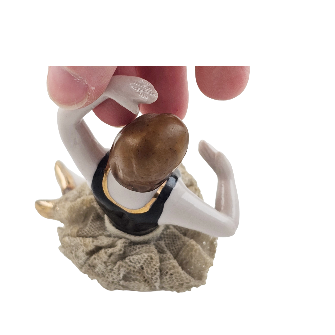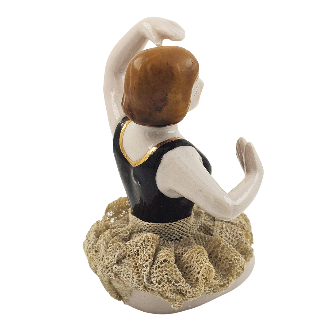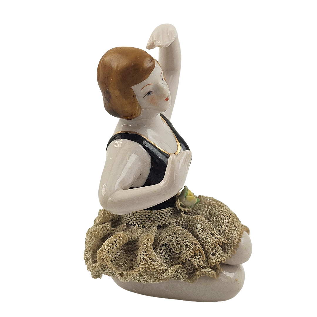 Discover the timeless charm of this rare Art Deco bathing beauty figurine—a seated ballerina rendered in fine porcelain bisque. She's dressed in an elegant black top with lustrous gold detailing and coordinating gold slippers, while a magnificent Dresden lace skirt drapes gracefully around her. A delicate yellow porcelain flower adorns her waist, adding a touch of botanical beauty. Her golden blonde hair and intricately painted features showcase remarkable artistry, and her dynamically posed arms capture the essence of graceful movement. A wonderful addition to any vintage figurine collection.