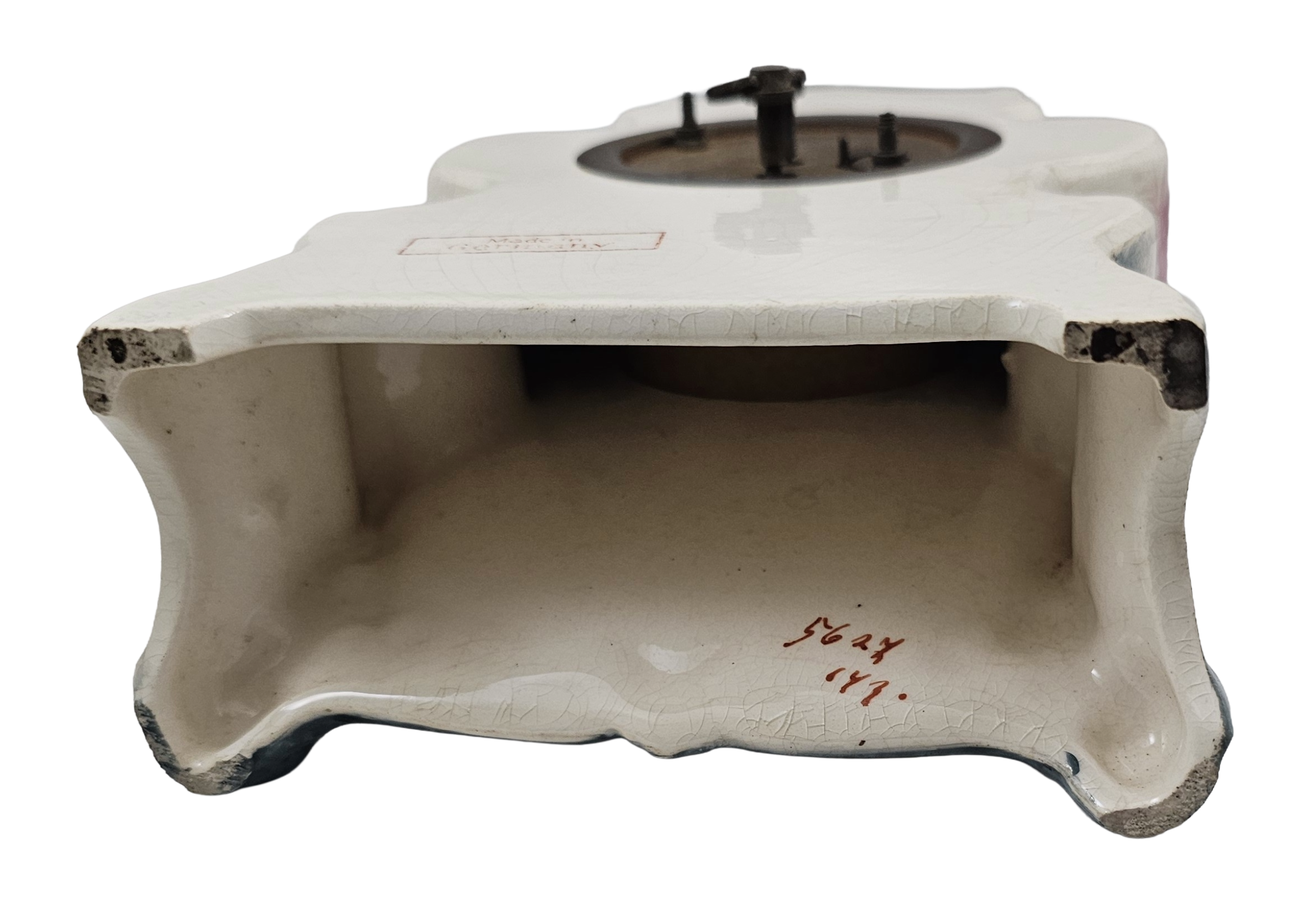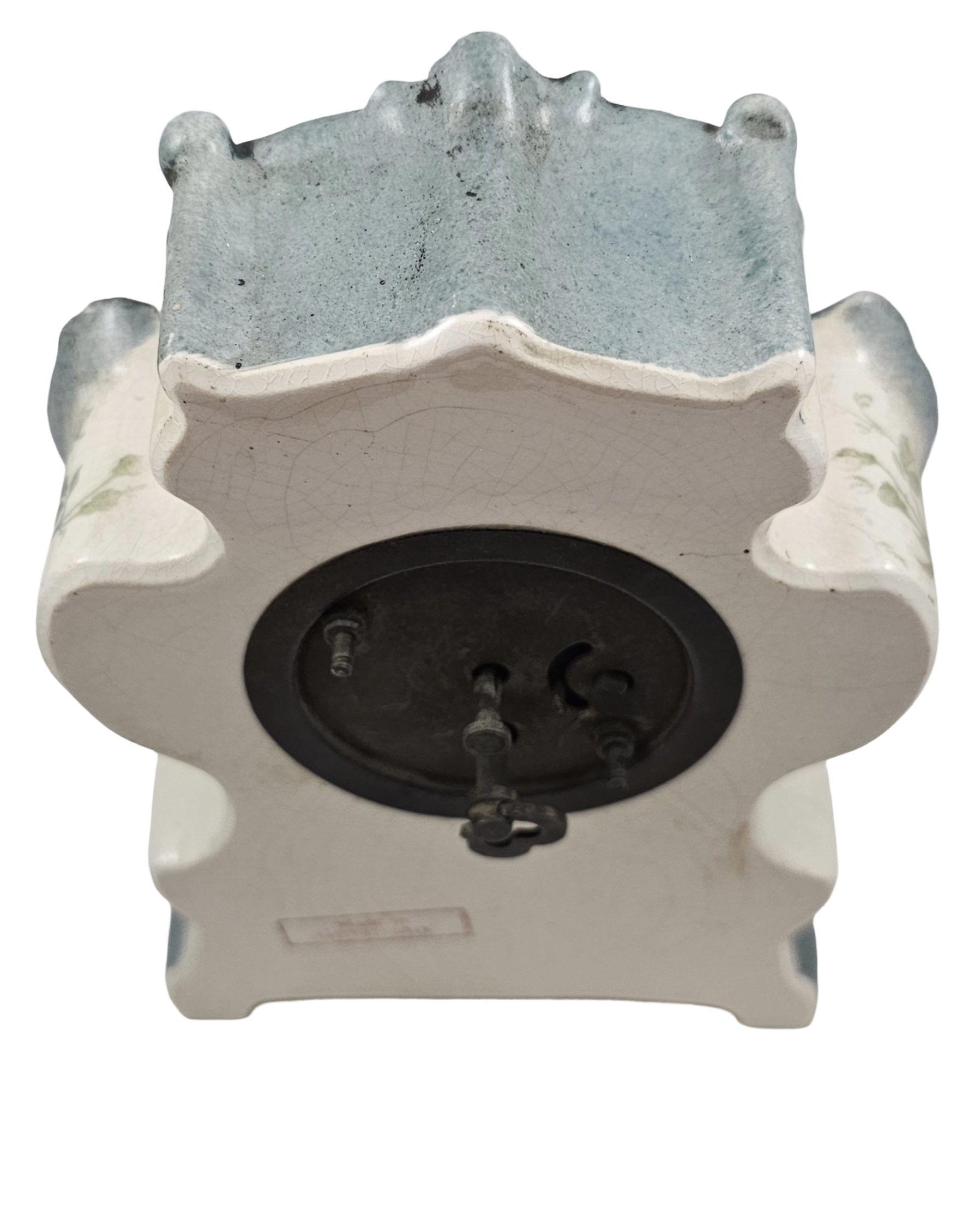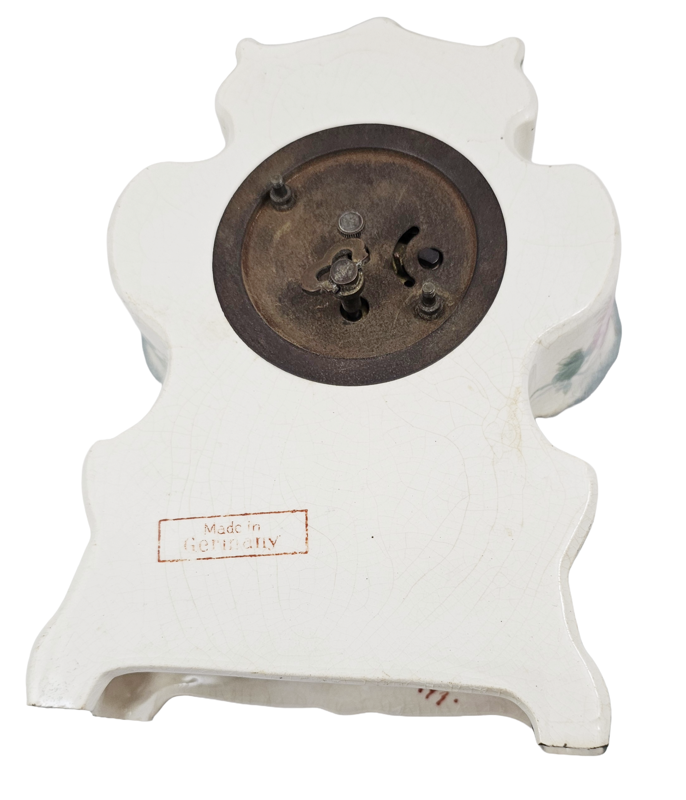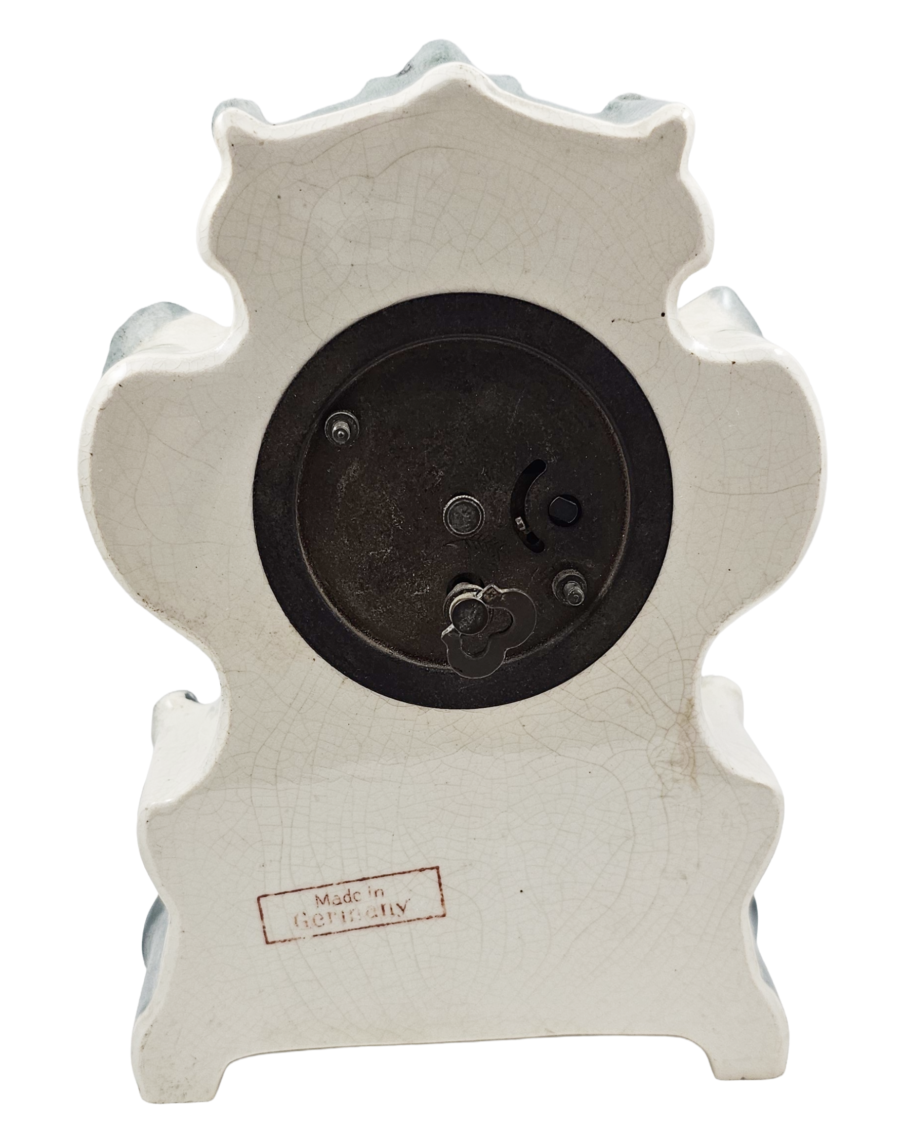Condition: No Chips, Cracks, or Repairs, does have overall craquelure consistent with age. Clock is in working condition with original key. I am not by any means a clock expert but was able to wind the key and it worked.