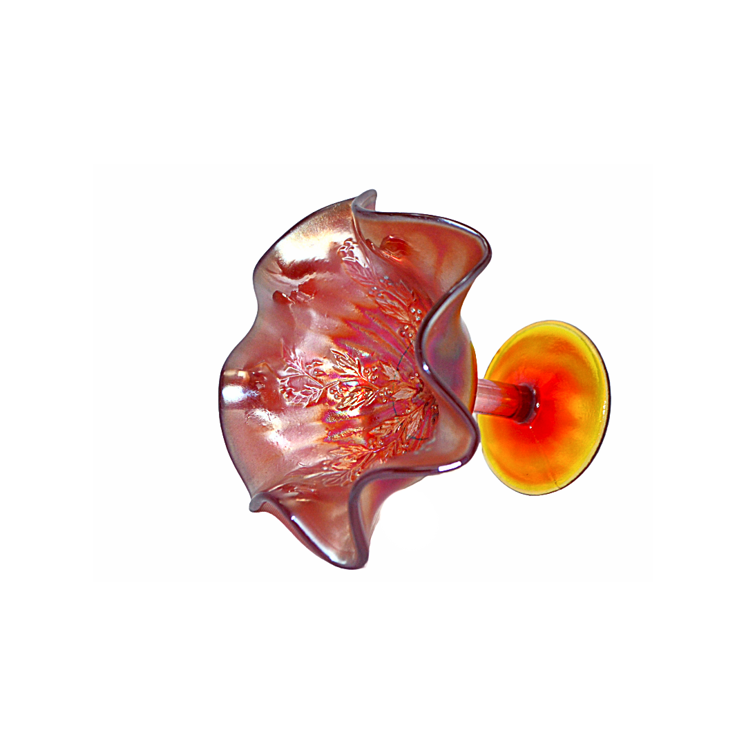An absolutely stunning Fenton carnival glass compote vase with Holly decoration in the very rare red and yellow amberina. The top and stem has the beautiful cherry red color extending down with flashes of the red coming through the yellow at the base. The colors and iridescence are simply gorgeous on this rare piece of glass, photographed in a variety of natural and LED lighting to show the color and true elegance of this wonderful piece of Fenton glass