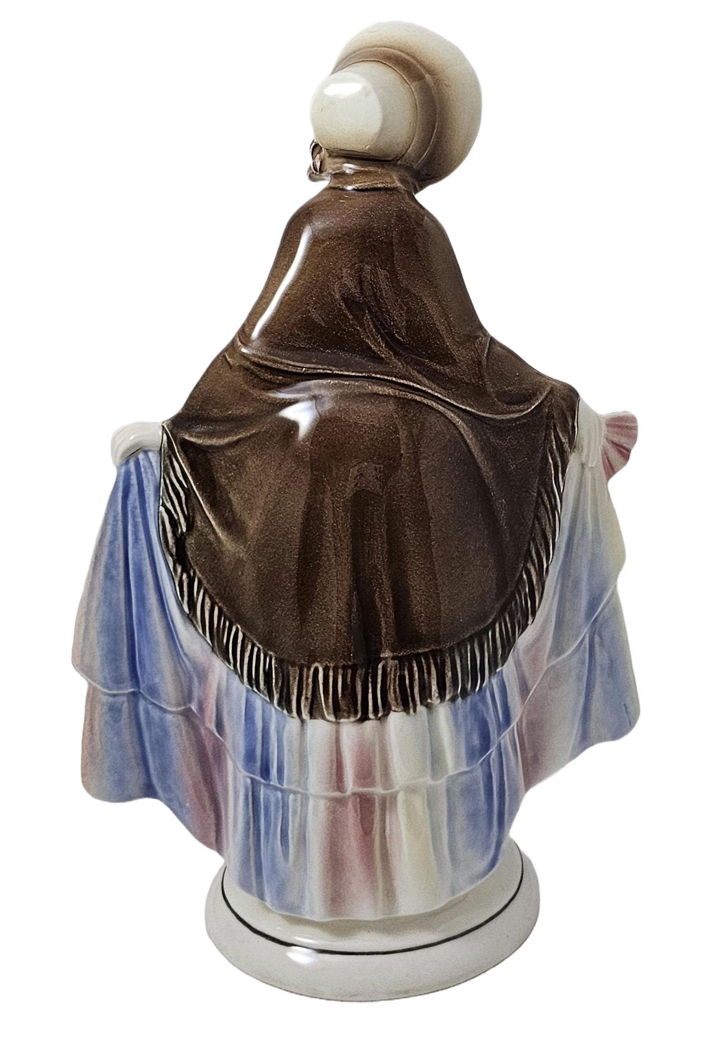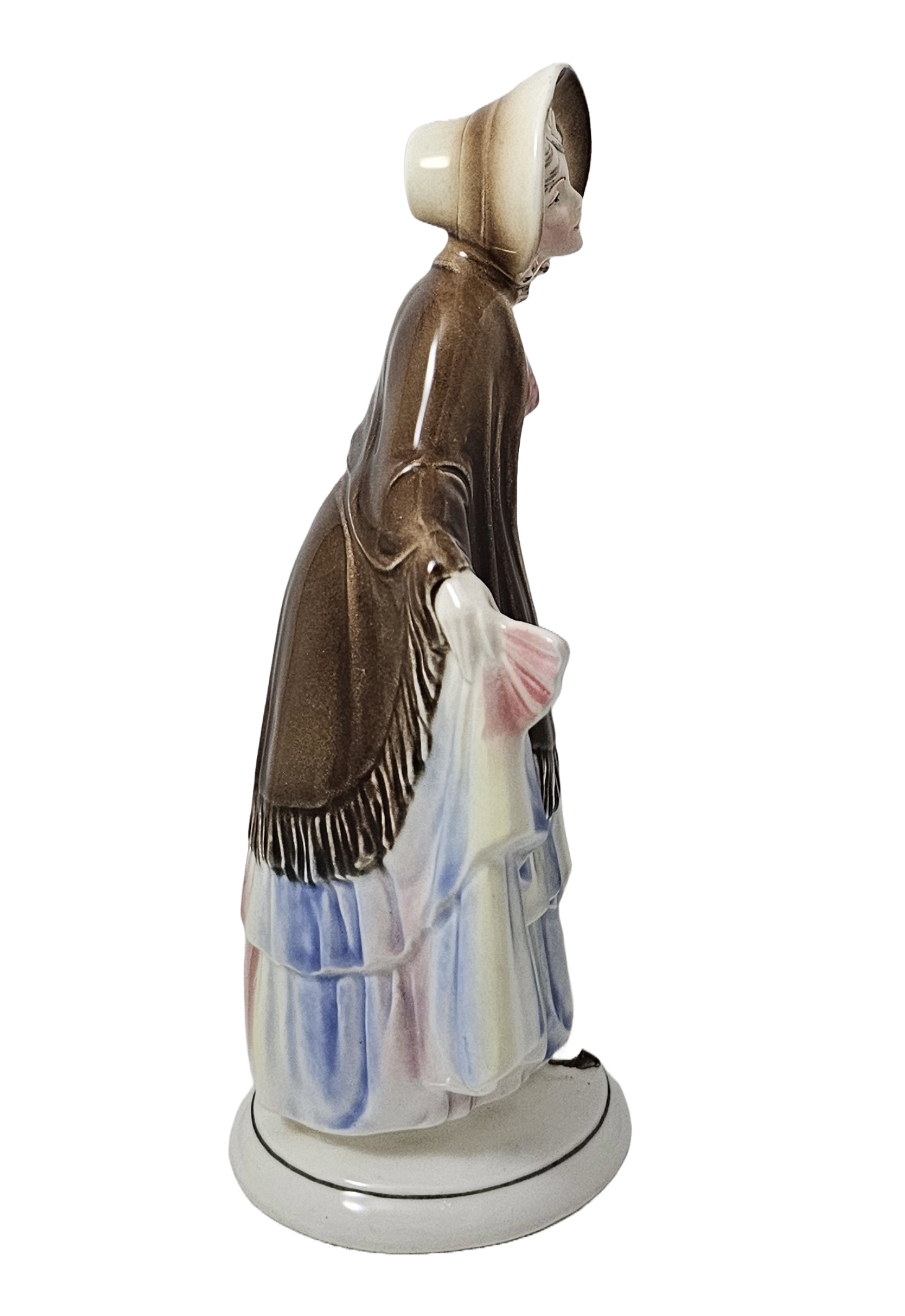 A lovely figurine by Hertwig Katzhutte Germany depicts a woman standing in a low cut bodice dress with flowing skirt of blue, yellow and pink, her top and fan that she holds matches the same pink tone, she also wears a chocolate covered shawl and bonnet, stands as she is performing a curtsy.