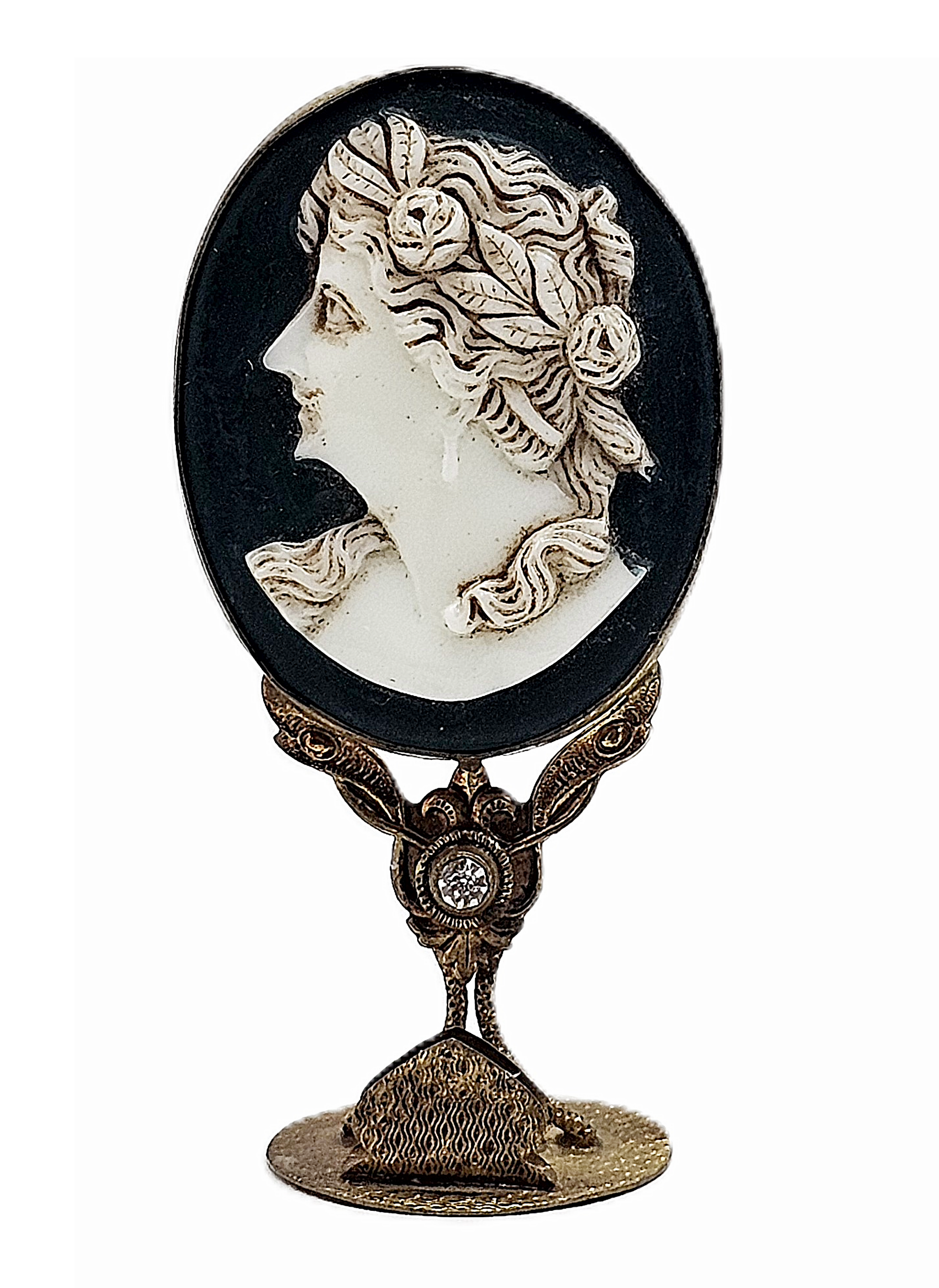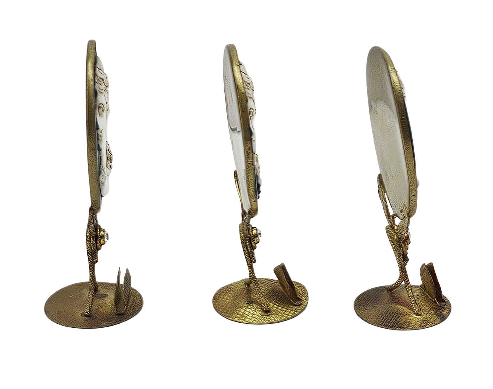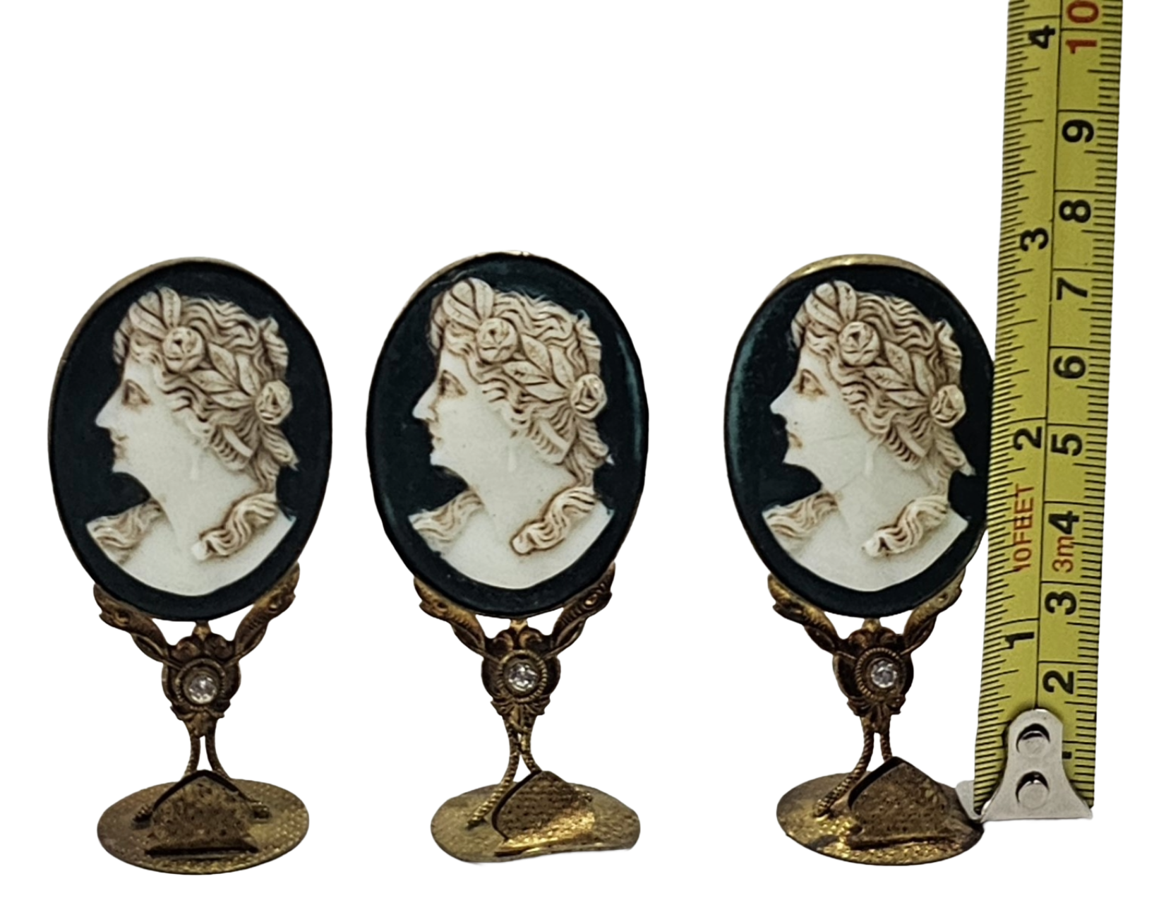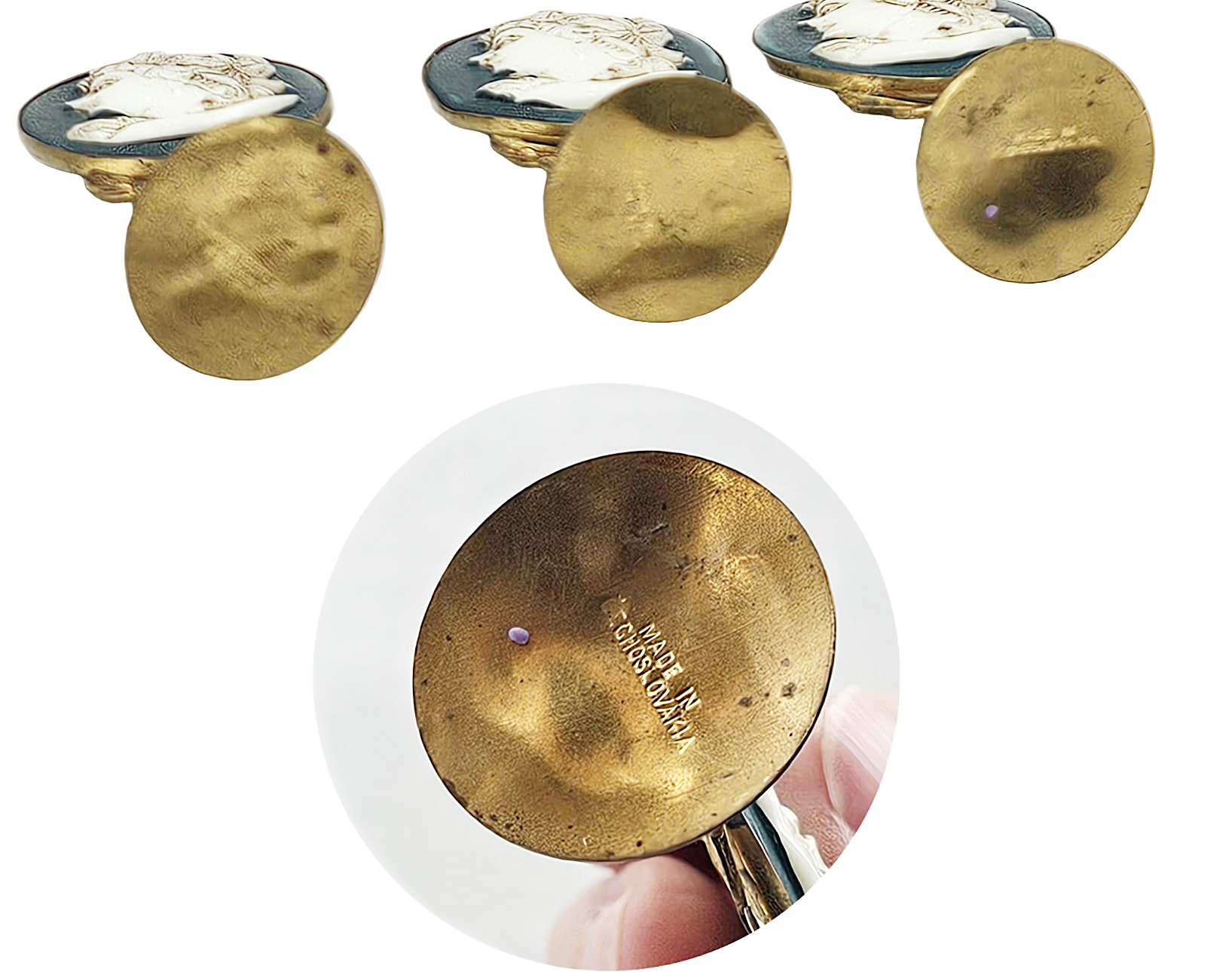 Discover the timeless elegance of this exceptional trio of Czech place holders, each featuring masterfully carved cameo portraits of classical women set against lustrous black onyx. The ornate brass ormolu foundations showcase brilliant "diamond-style" gemstones that catch the light beautifully. Stamped "Made in Czechoslovakia," these sophisticated pieces represent a vanishing era of craftsmanship and are treasured finds for serious collectors seeking authentic vintage tableware with genuine character and historical significance.