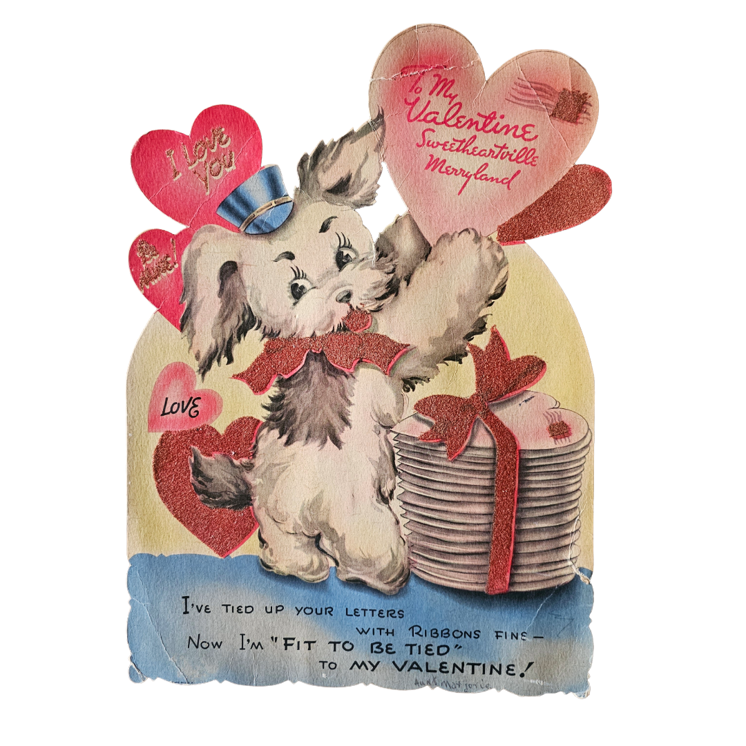 Large Vintage Die Cut Valentine Card 'Mailman' Puppy Dog Holding Heart Mail with glitter on ribbon and hearts, Sweetheartville Merryland