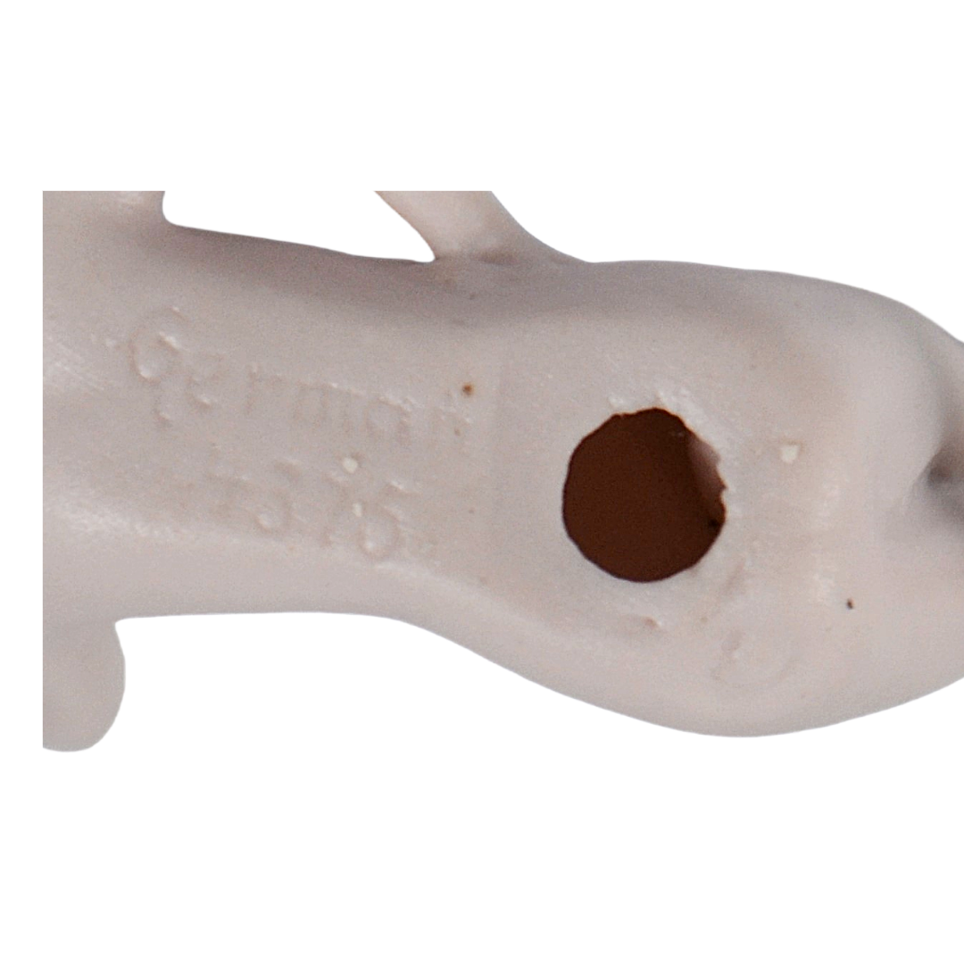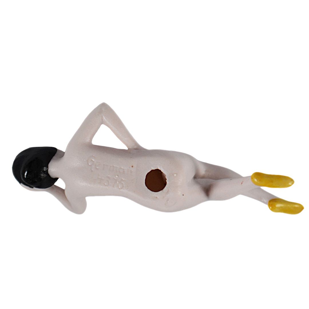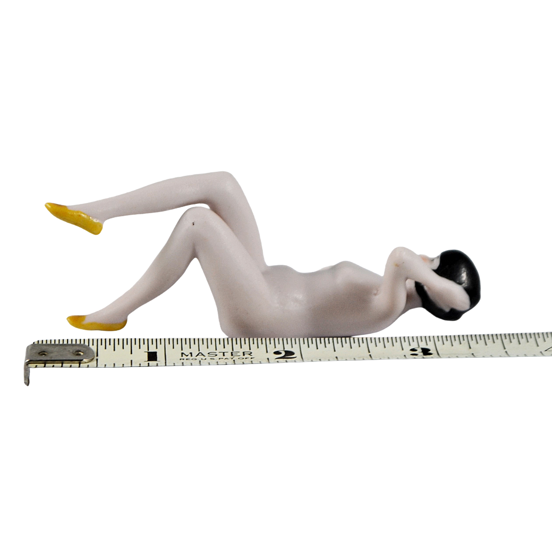 Discover the elegance of this authentic German porcelain bathing beauty from the Art Deco era. Crafted in bisque with meticulous hand-painted details, she embodies the spirit of the 1920s with her signature bobbed hair, fashionable yellow slippers, and graceful pose. The figurine's carefully rendered features and dynamic positioning—arm behind her head, legs crossed—showcase the skilled artistry of the period. Bearing the maker's mark "Germany 4375," this charming piece is a treasured collectible for those who appreciate vintage character and timeless design.
