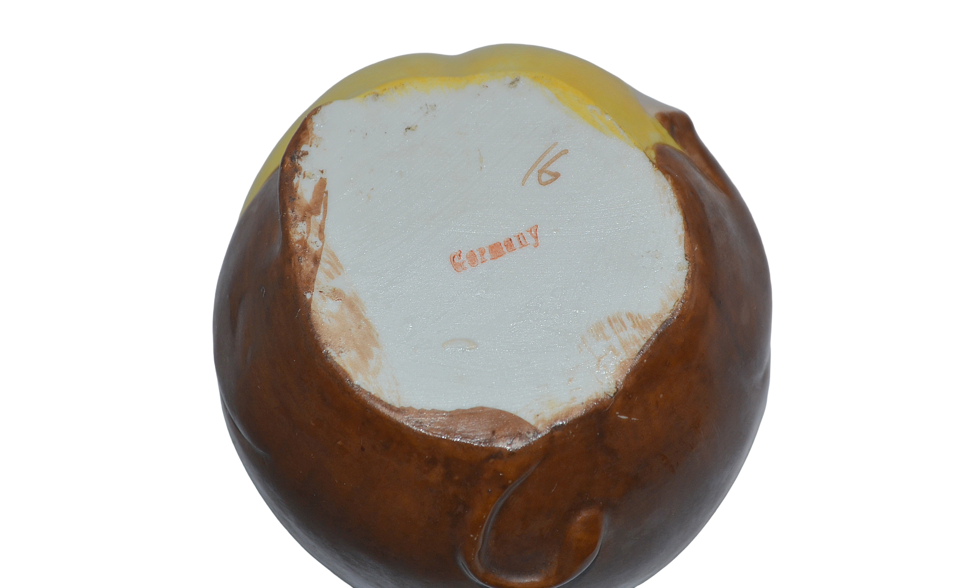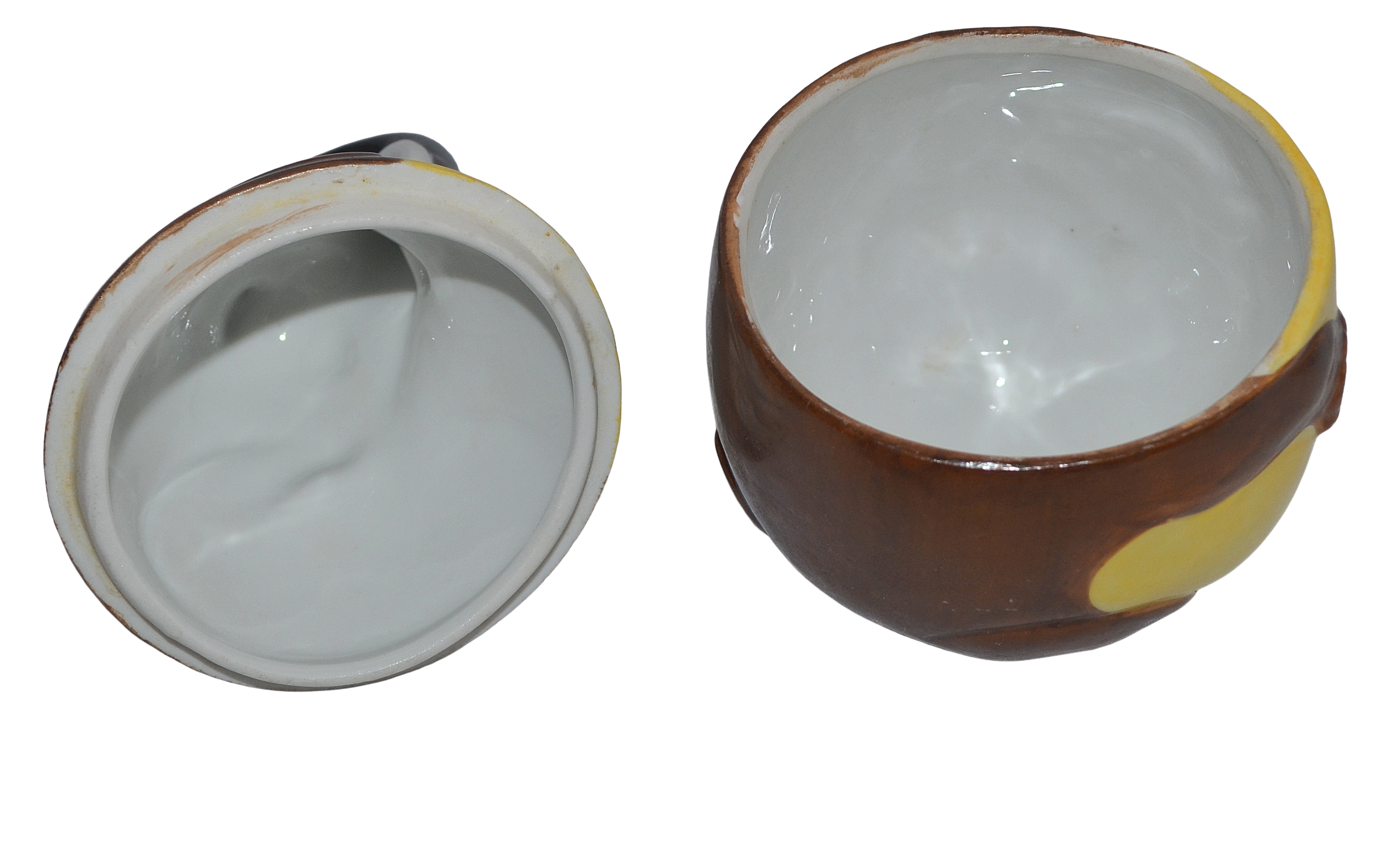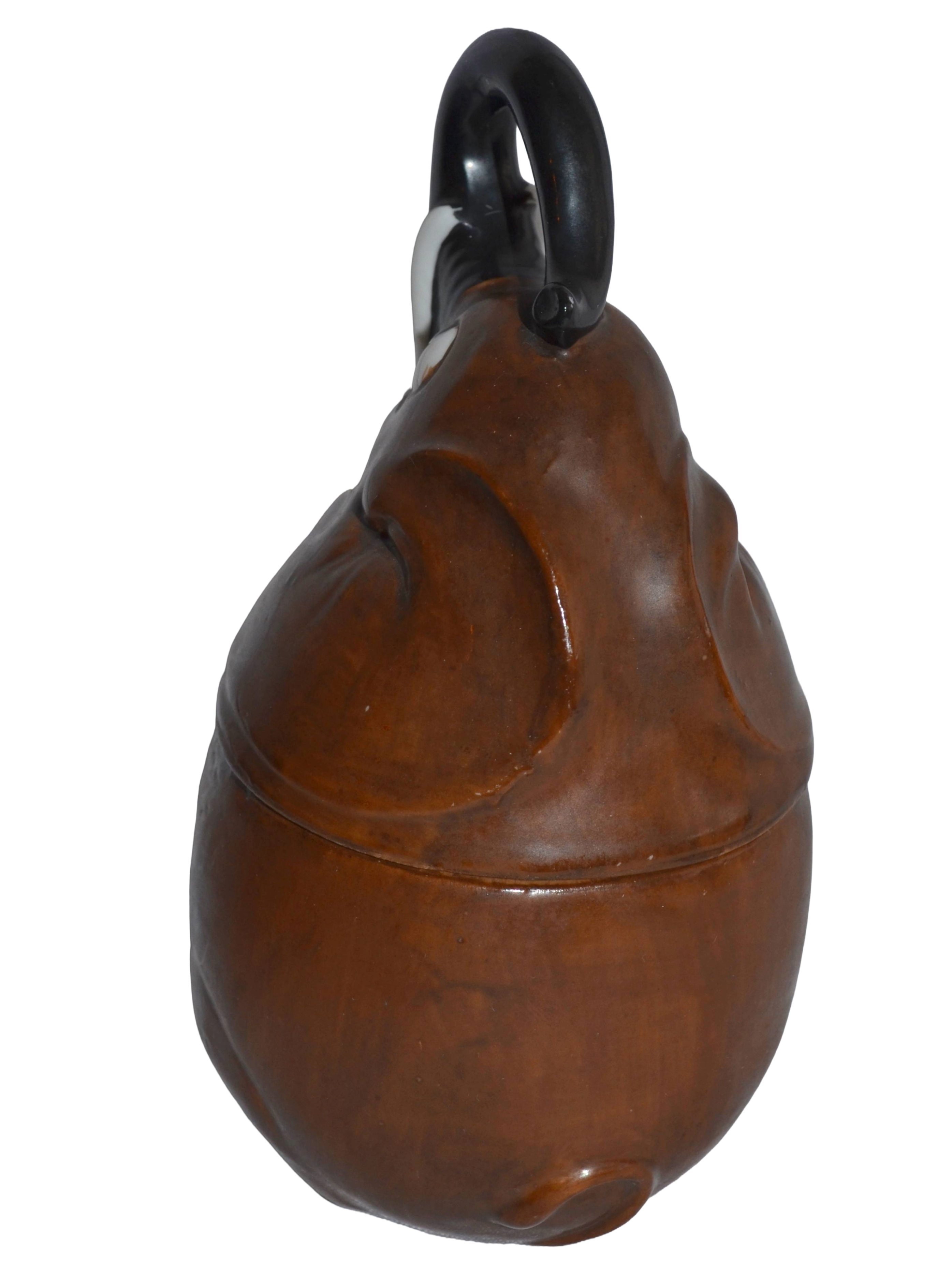 This exquisite porcelain covered jar shaped like an elephant features vibrant polychrome painting and fine detail. Likely designed as a tobacco humidor, it also works beautifully as a vanity or sugar jar. Attributed to Schafer Vater, its meticulous craftsmanship echoes the charming figural animals—such as nippers and creamers—typical of the renowned German porcelain makers. The eyes closely resemble those found on sought-after Art Deco figural pitchers, highlighting its collectible appeal. This unique piece is a striking addition for any collector of elegant, whimsical ceramics.