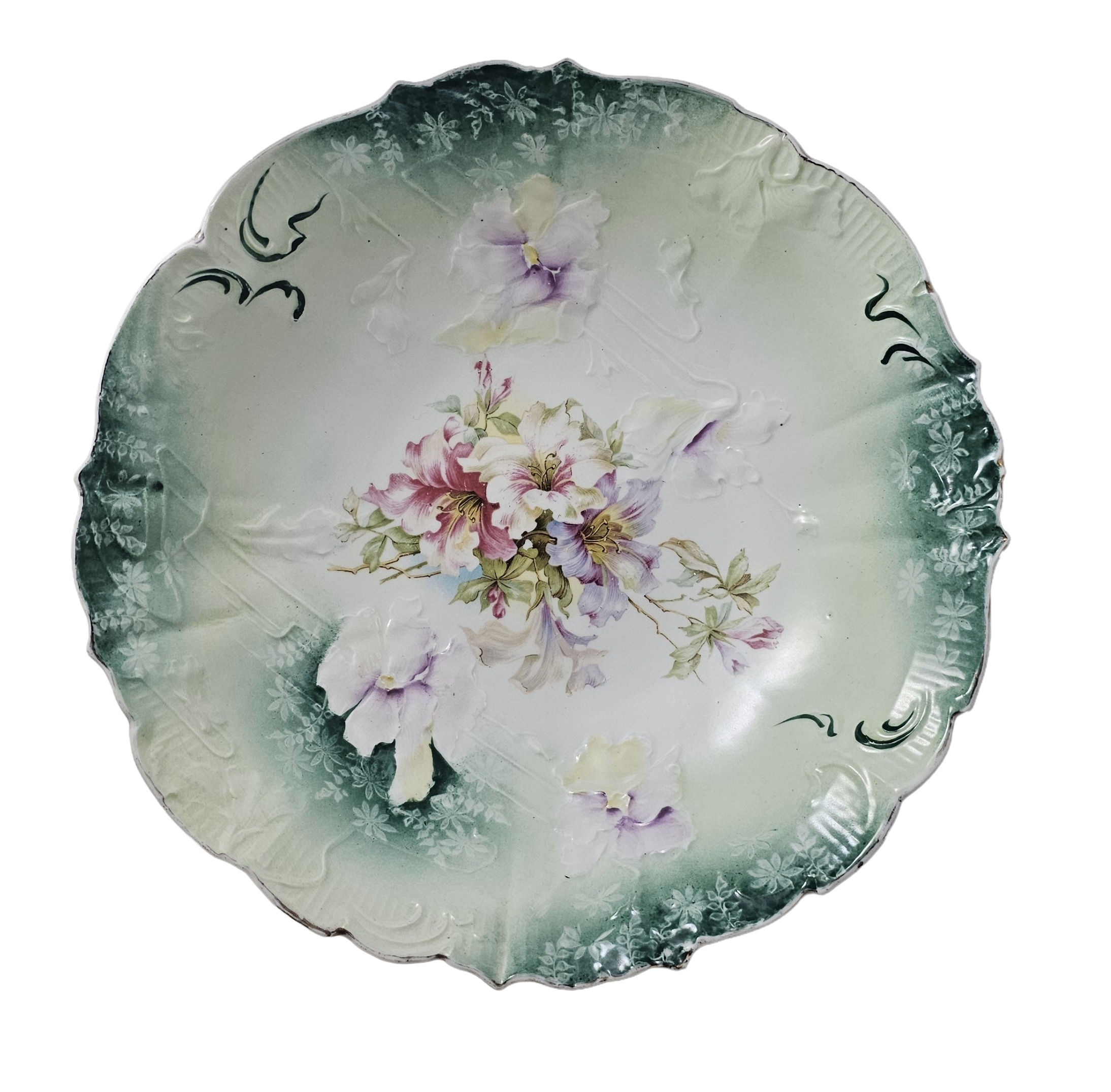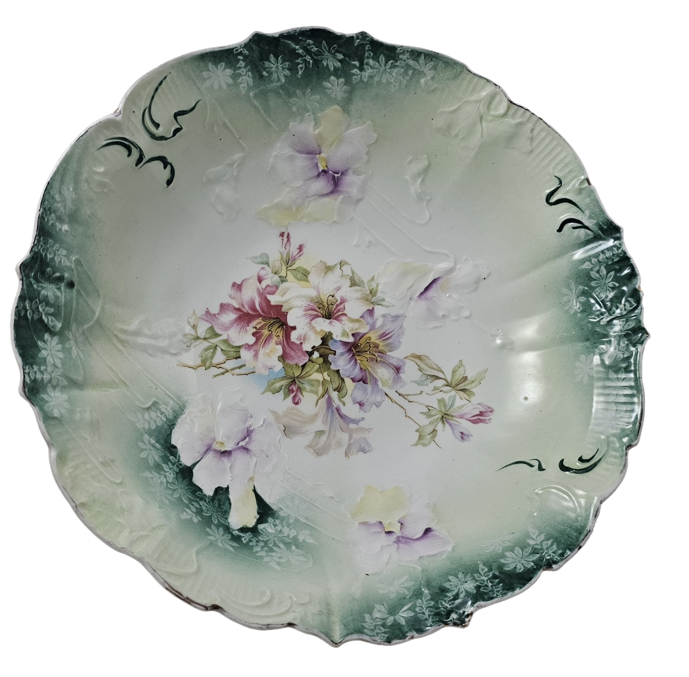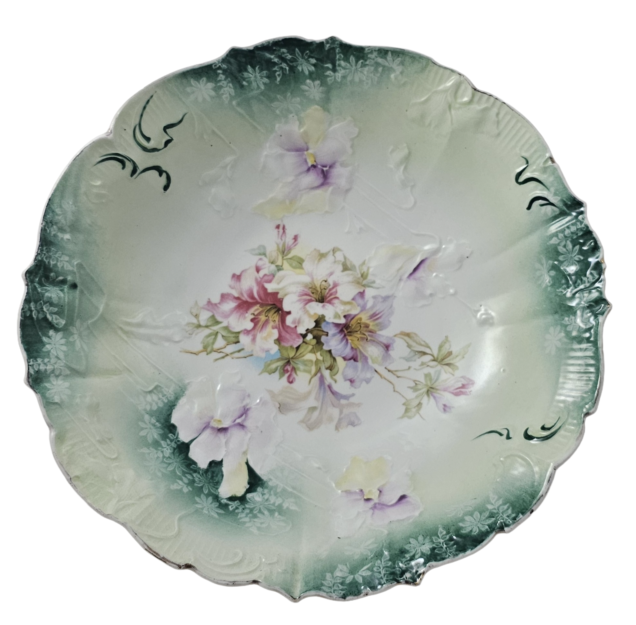 This charming RS Prussia treasure showcases exquisite German craftsmanship with its signature Mold 32 design. The scalloped bowl features a striking teal rim adorned with stenciled florals, while the interior bursts with dimensional molded flowers in soft pinks and lavenders. The HI 4 decor pattern creates beautiful raised details throughout, making this piece a delightful addition to any vintage porcelain collection. A true gem for collectors who appreciate fine artistry and timeless elegance.
