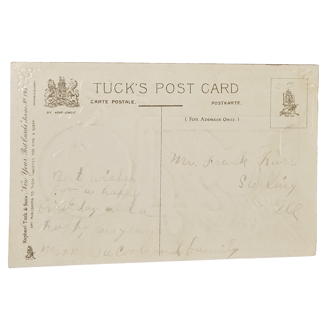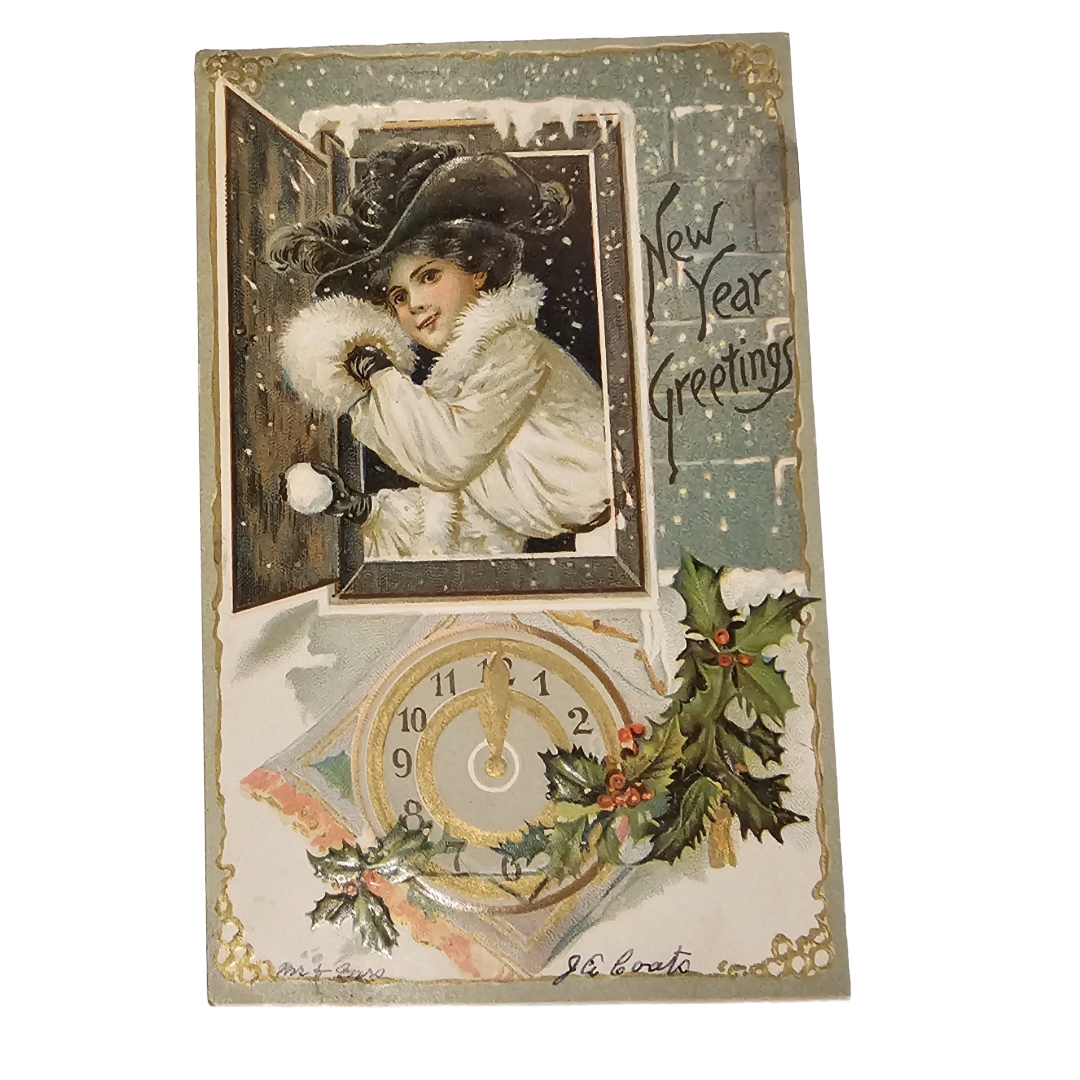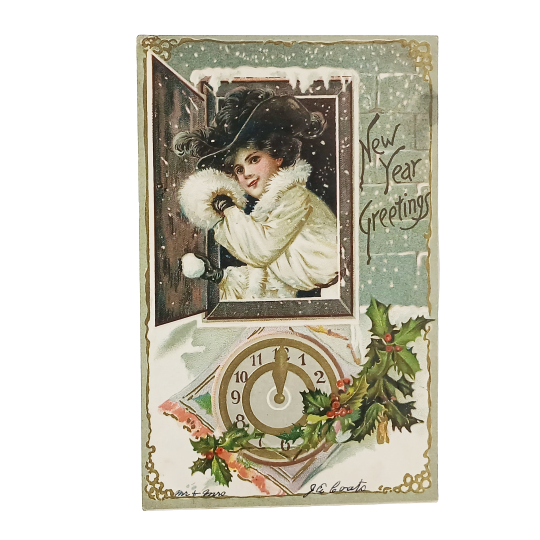 Ring in the season with this exquisite New Year's greeting postcard from the prestigious Raphael Tuck Series 145. Featuring a refined woman in white gazing from a window, snowball in hand and cozy muff at her side, with an ornate clock marking the moment below. The gilt embossed details and Saxony printing showcase the exceptional craftsmanship of this vintage treasure. As part of an original 24-card collection, this piece represents a significant find for postcard enthusiasts and collectors of early holiday ephemera.