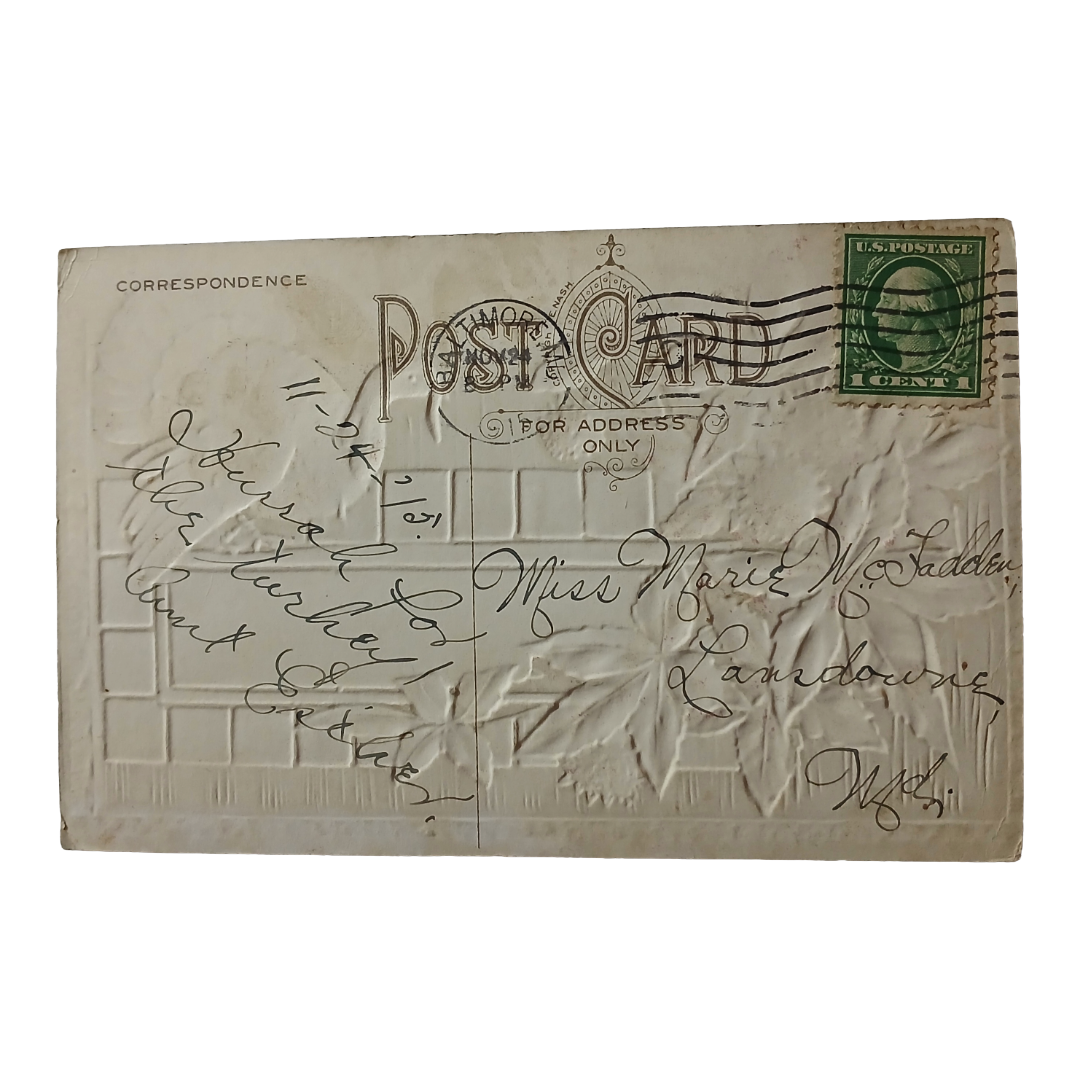 Thanksgiving Postcard Embossed Turkey Autumn Leaves Landscape