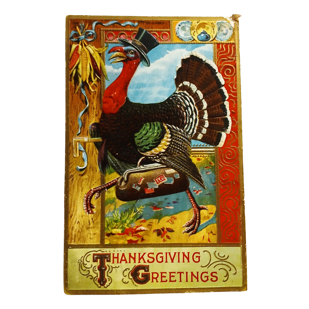 Thanksgiving Postcard Turkey in Top Hat w/ Briefcase Autumn Background