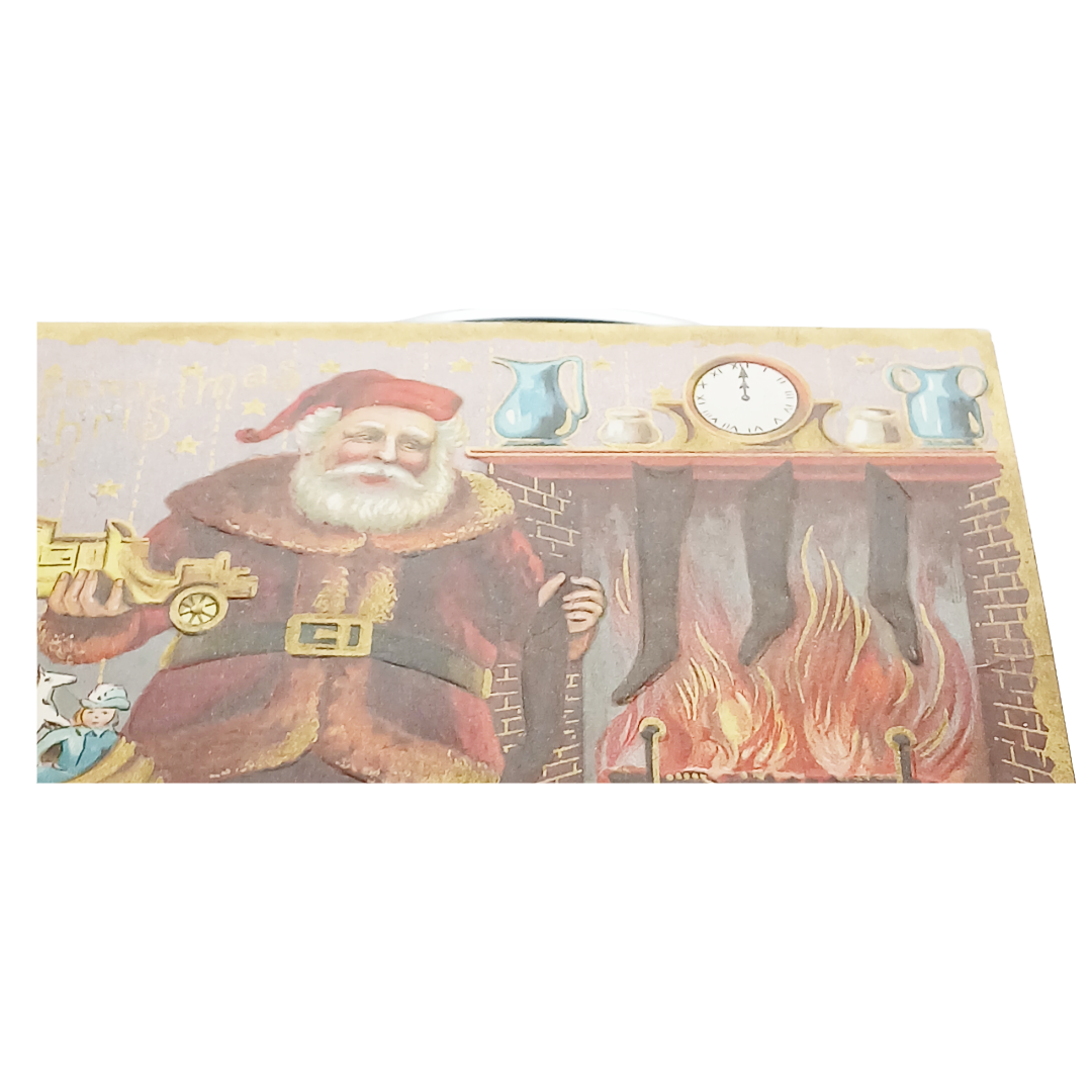 Christmas Postcard Santa Claus Holding Toy Car Fire Mantle with Gold Highlights