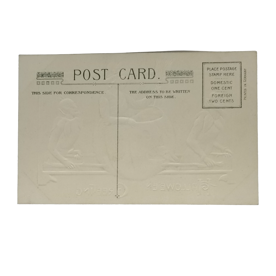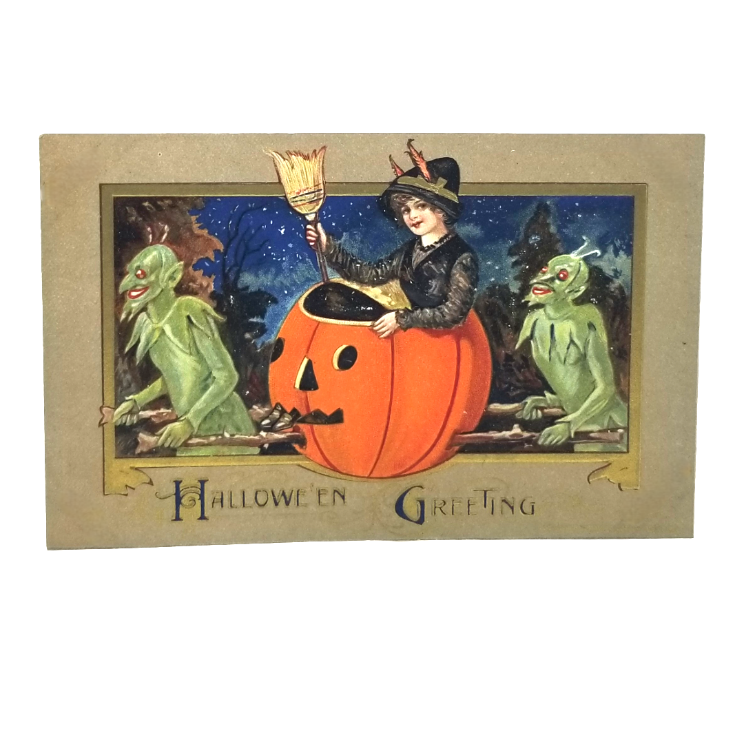 This Halloween postcard daringly depicts a striking witch riding inside a giant JOL, carried by mischievous green goblins. Crafted by artist John Schmucker and published by John Winsch, it’s a bold and unforgettable image.
