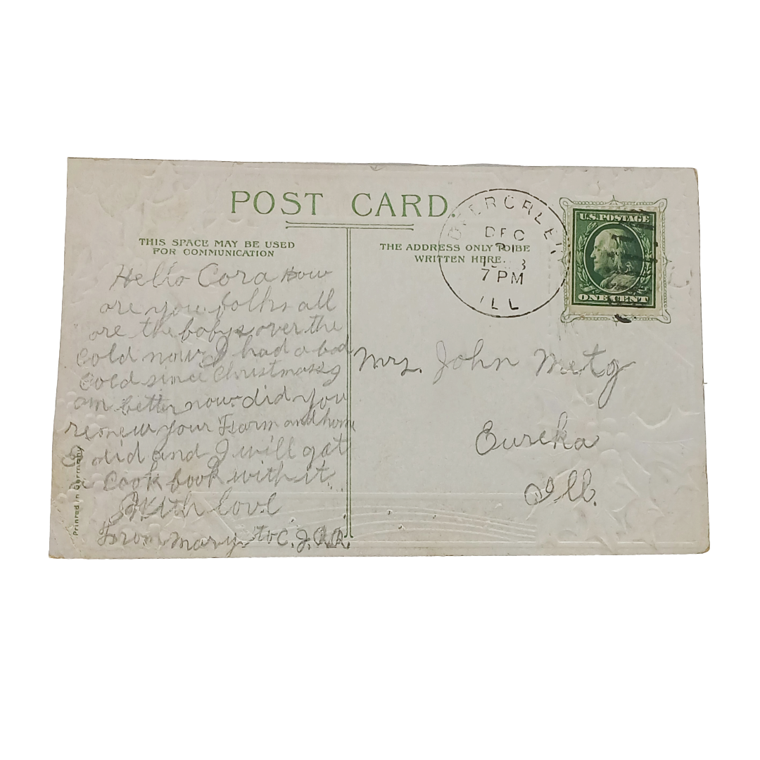 New Year Postcard Cherub Perched Atop Portrait Of Snowy House...