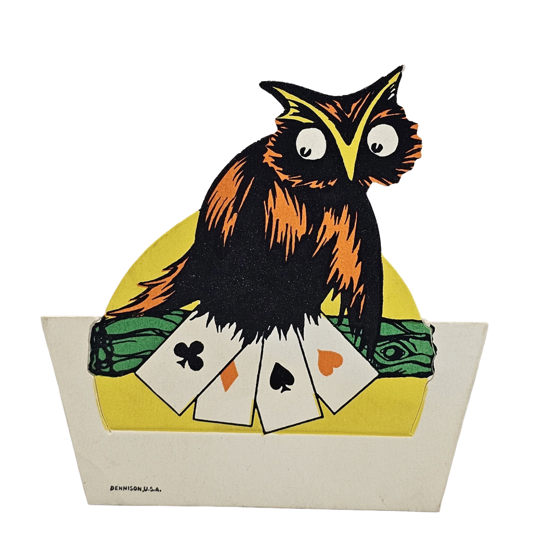 Vintage Dennison Halloween Die Cut Place Card Owl Holding Playing Cards
