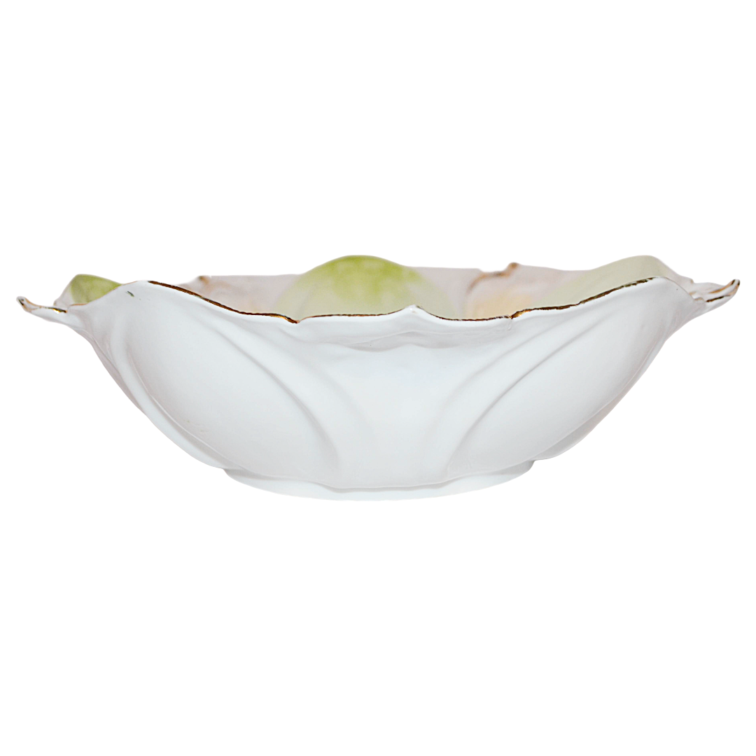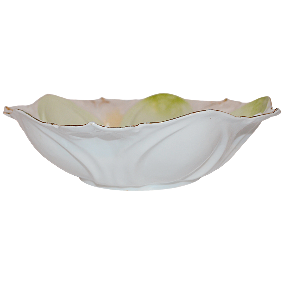A lovely RS Prussia bowl in a light green panels against a peach to white background with pink flowers in the center, the bowl has the attractive dome scallops along the interior and gold scroll design at the rim.
