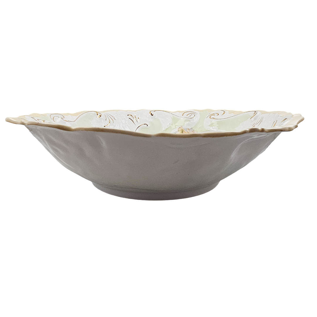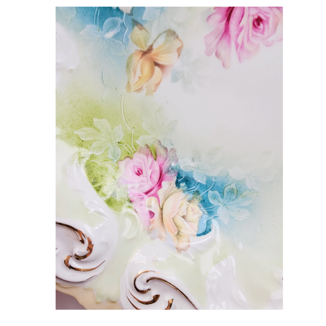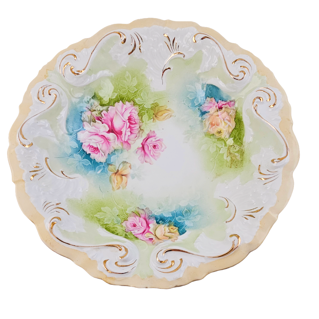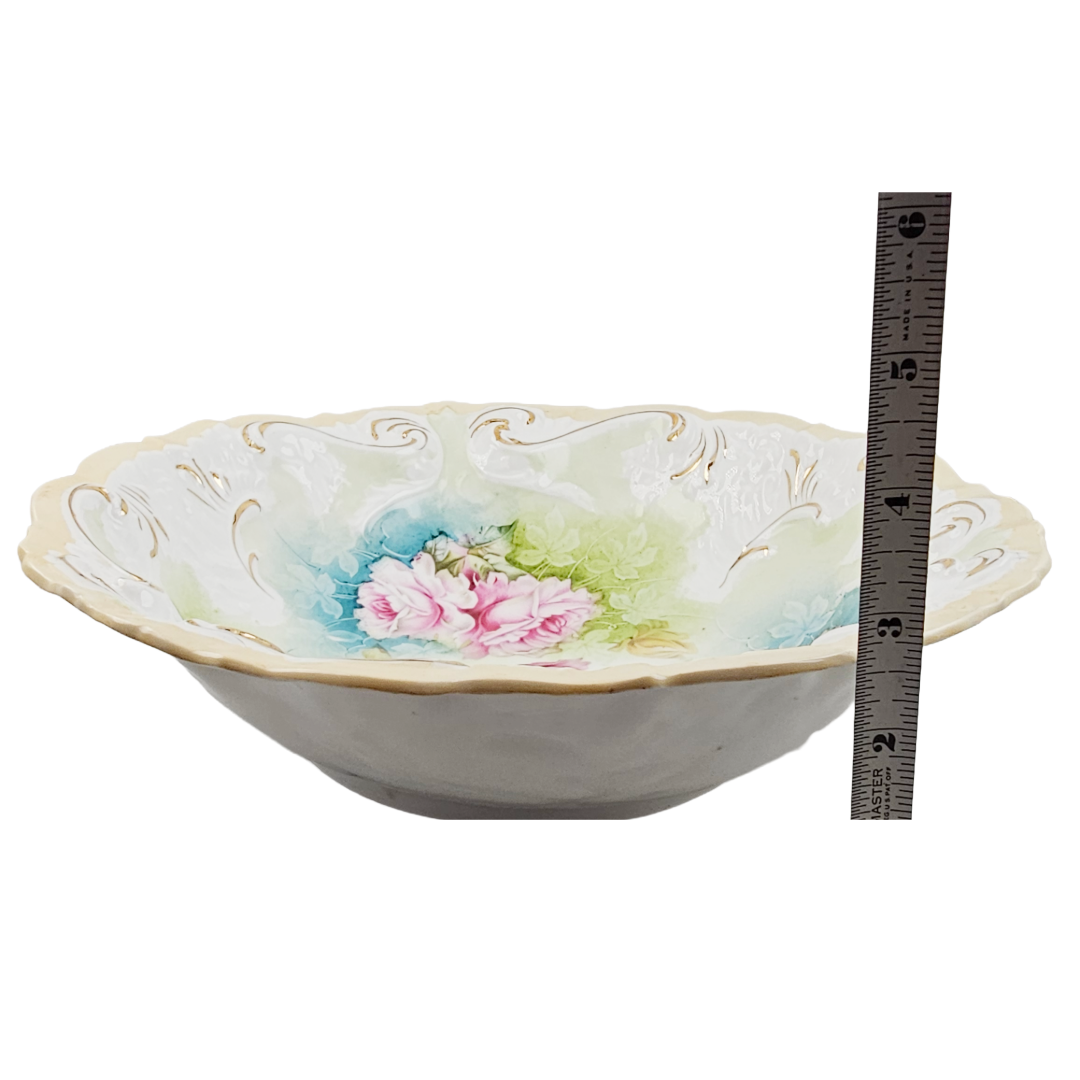 This exquisite RS Prussia bowl showcases the artistry of early 20th-century porcelain craftsmanship. Featuring the classic Mold 1 design, it displays beautifully rendered pink and peach roses complemented by delicate etched trailing flowers in soft blue and green tones. The piece is distinguished by its distinctive blow-out rim in pale apricot, with the molded details enhanced by warm gold gilding throughout. An impressive collector's piece, this unmarked bowl bears the impressed number 80 and represents the quality and elegance that made RS Prussia porcelain highly sought after by enthusiasts and decorators alike.