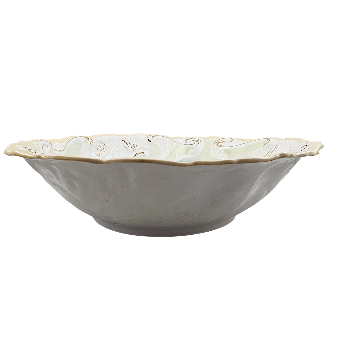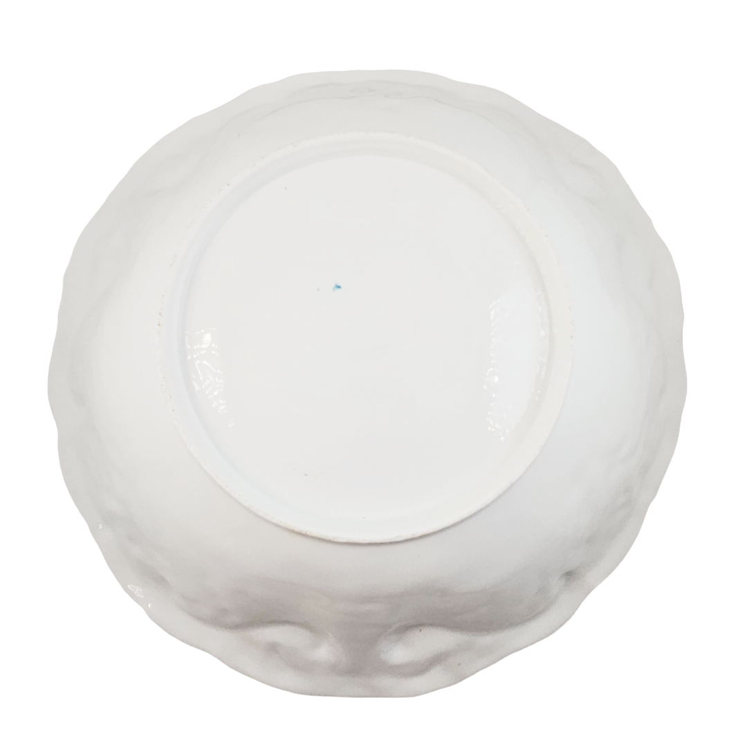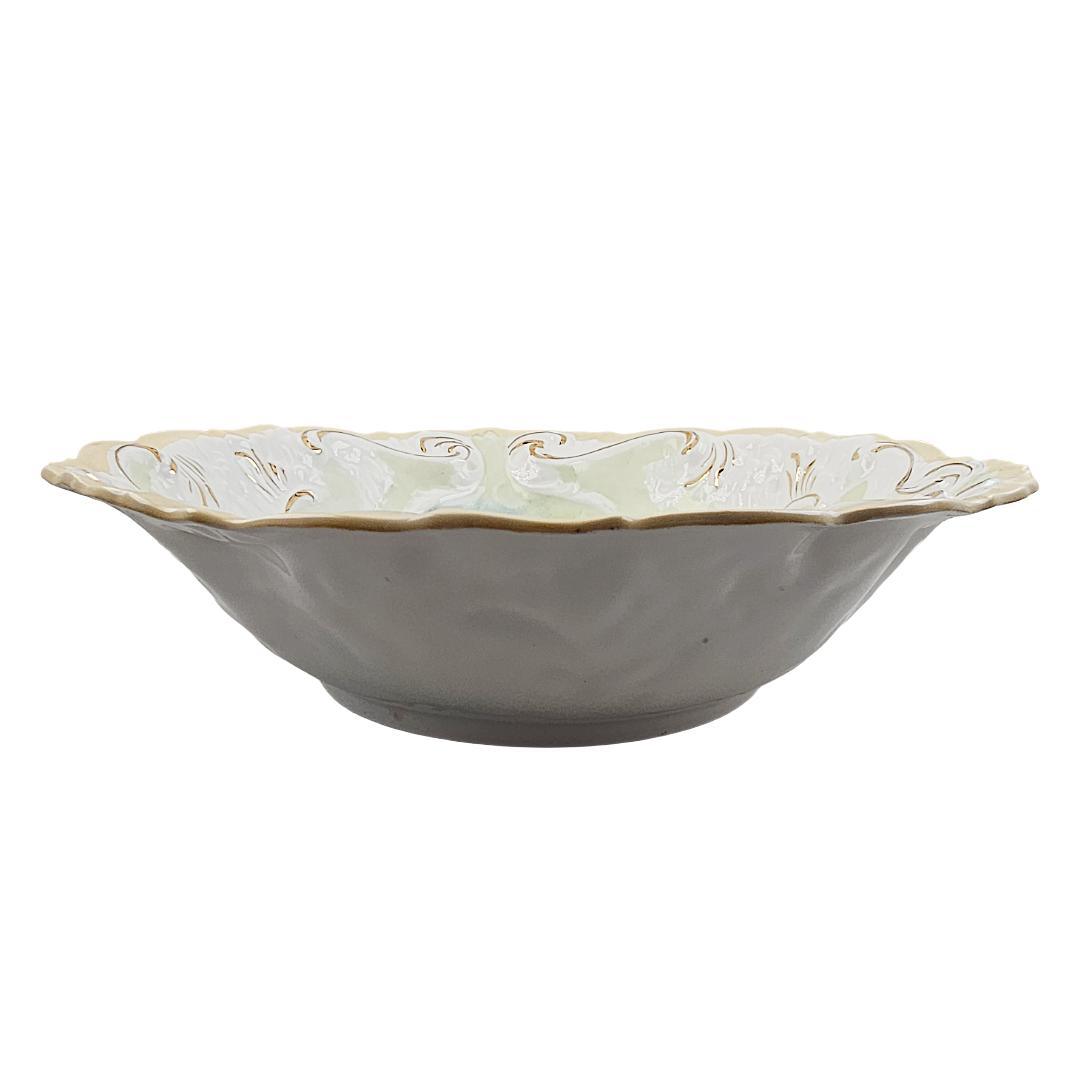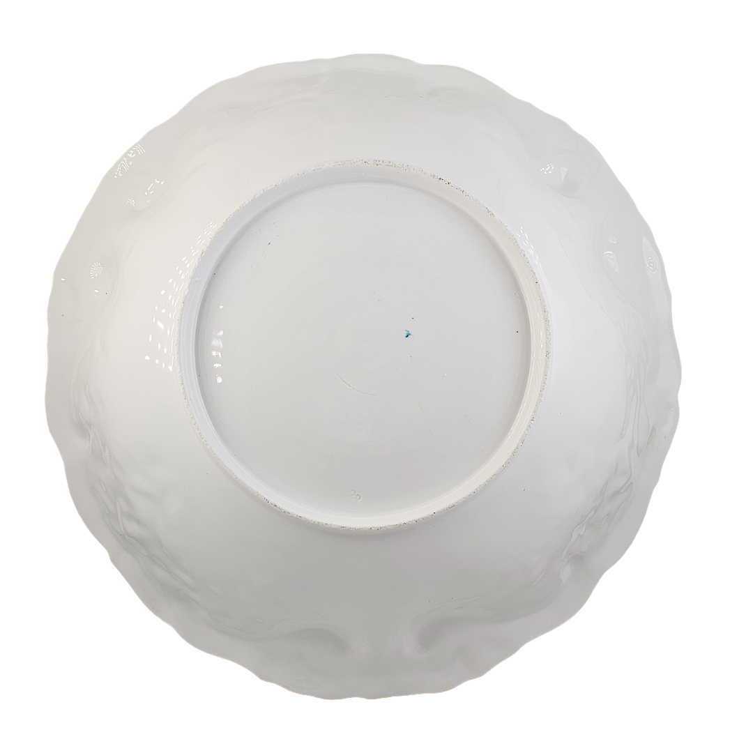 This exquisite RS Prussia bowl showcases the artistry of early 20th-century porcelain craftsmanship. Featuring the classic Mold 1 design, it displays beautifully rendered pink and peach roses complemented by delicate etched trailing flowers in soft blue and green tones. The piece is distinguished by its distinctive blow-out rim in pale apricot, with the molded details enhanced by warm gold gilding throughout. An impressive collector's piece, this unmarked bowl bears the impressed number 80 and represents the quality and elegance that made RS Prussia porcelain highly sought after by enthusiasts and decorators alike.