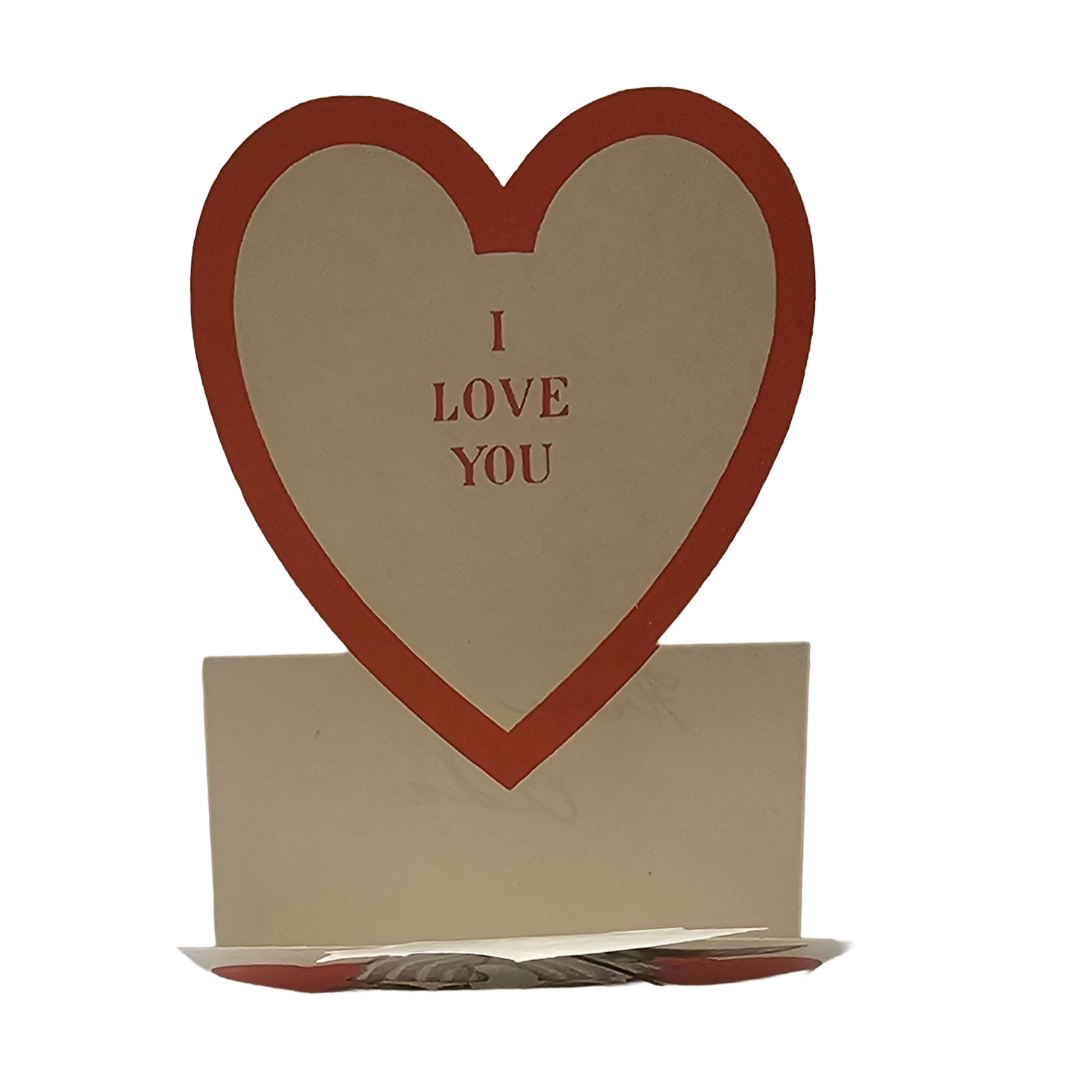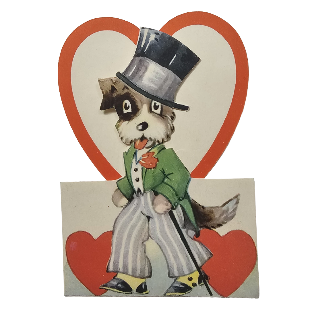 Send a heartfelt message with this vintage die-cut Valentine card featuring an anthropomorphic dog dressed in a green suit, top hat, and cane, surrounded by hearts. The card folds down to reveal a sweet "I love you" inside, making it a charming way to express your affection.
