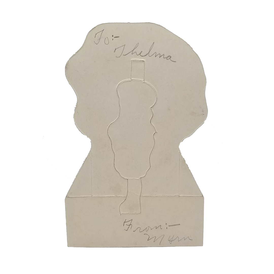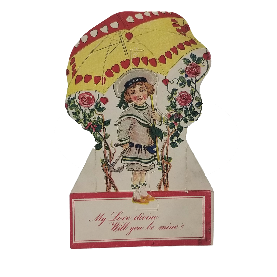 Die Cut Valentine Card Child in Navy Sailor Suit Under Umbrella of Hearts