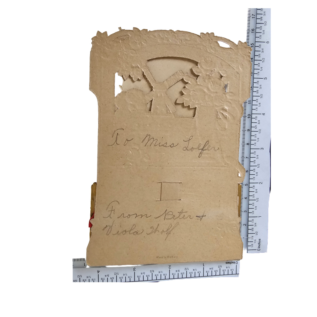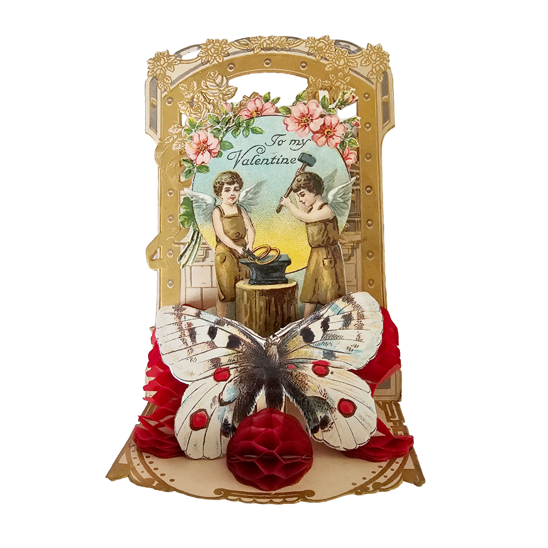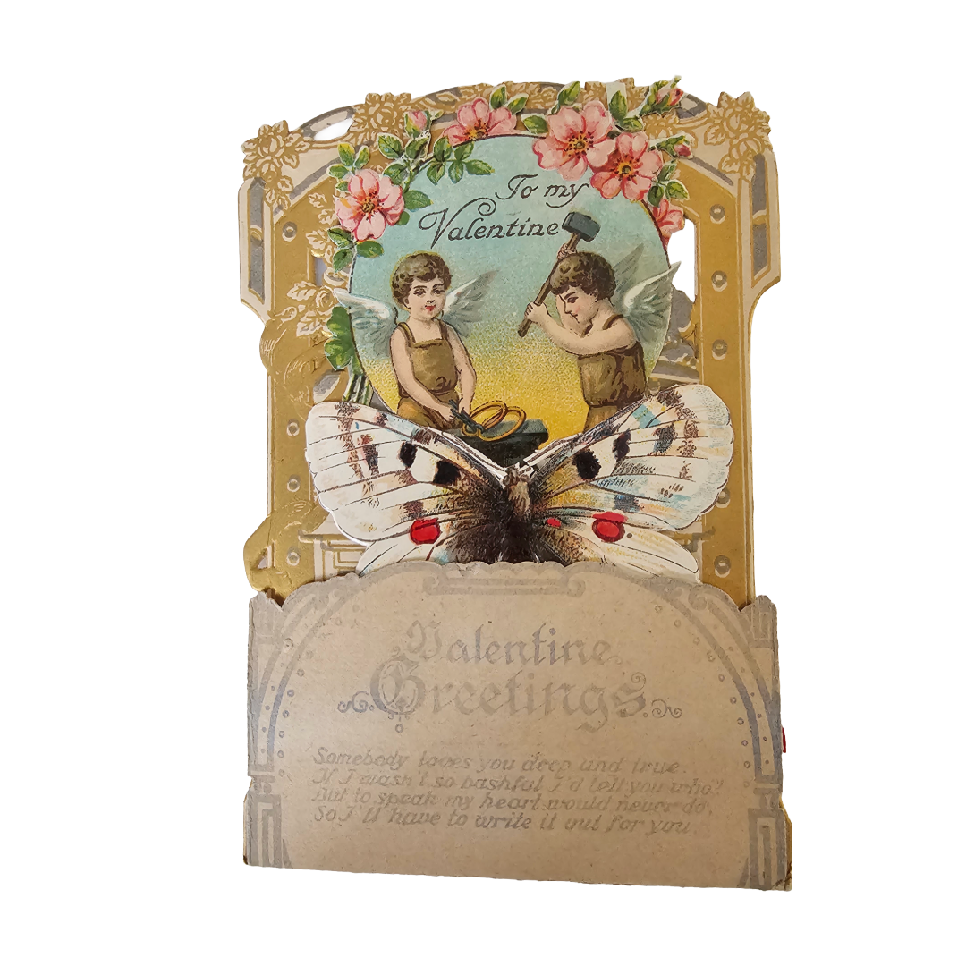 This charming vintage Valentine's card from Germany features an enchanting three-dimensional design with playful cupids constructing hearts, complemented by a delicate butterfly adorning the front. A delightful piece that captures the whimsy and craftsmanship of classic holiday greetings, perfect for collectors of nostalgic ephemera or anyone who appreciates the artistry of traditional die-cut cards.