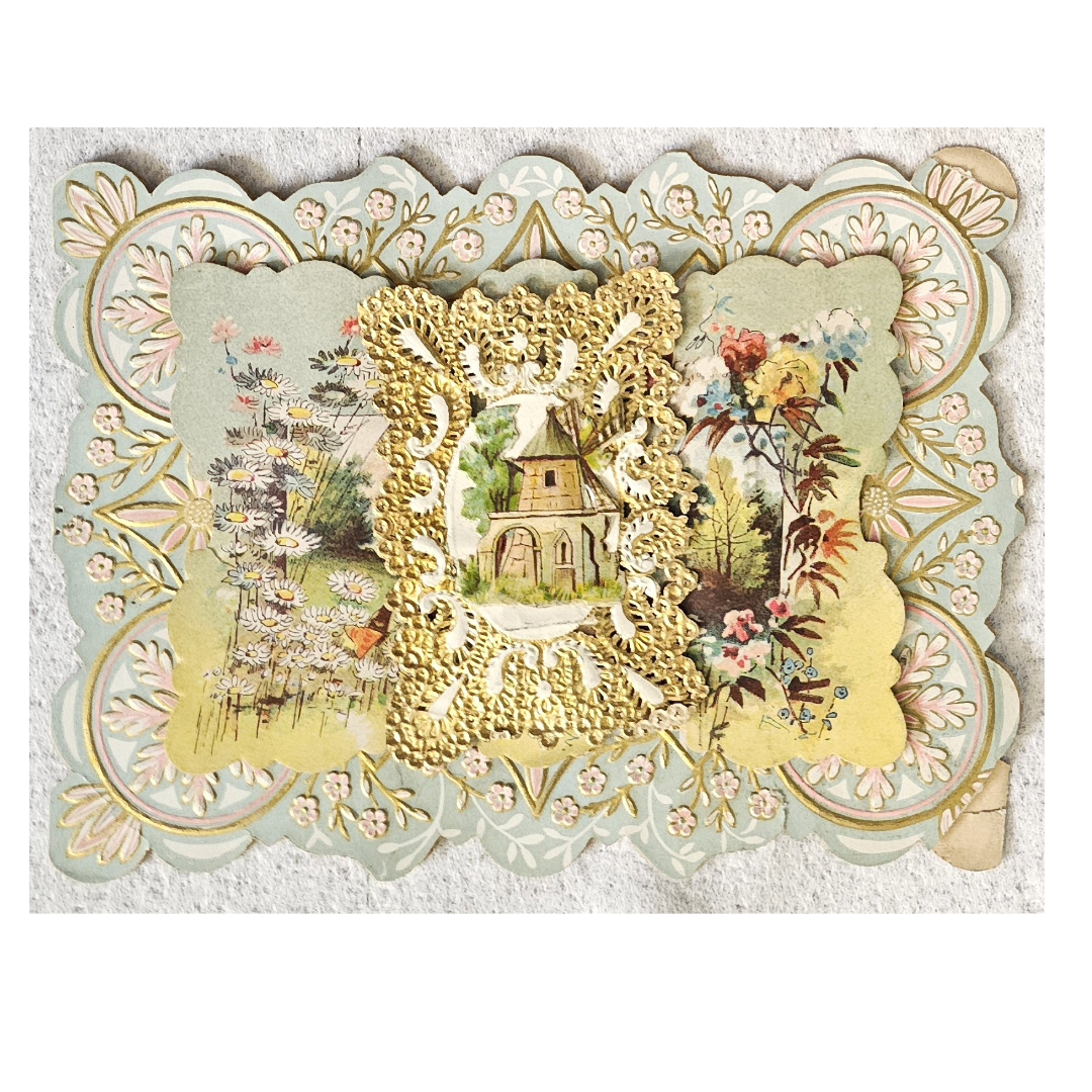 Antique Die Cut 1800s Valentine Card House Nestled in Flower Field Gold Lace