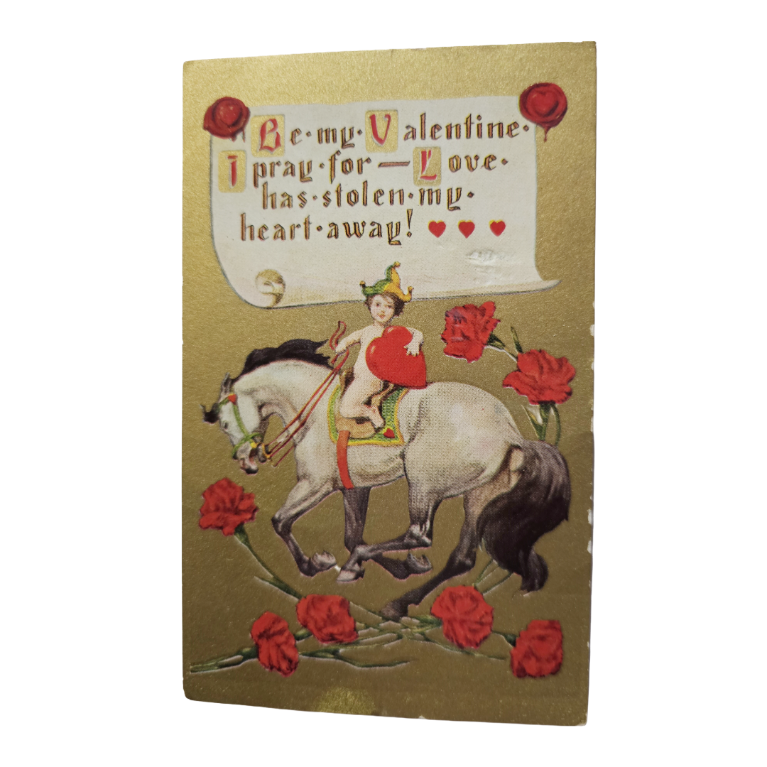 Valentine Postcard Cupid Holding Hearts Riding Stallion Horse