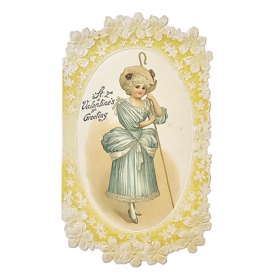 Antique German Heavy Die Cut Embossed Valentine's Card Bo Peep Girl by Brundage