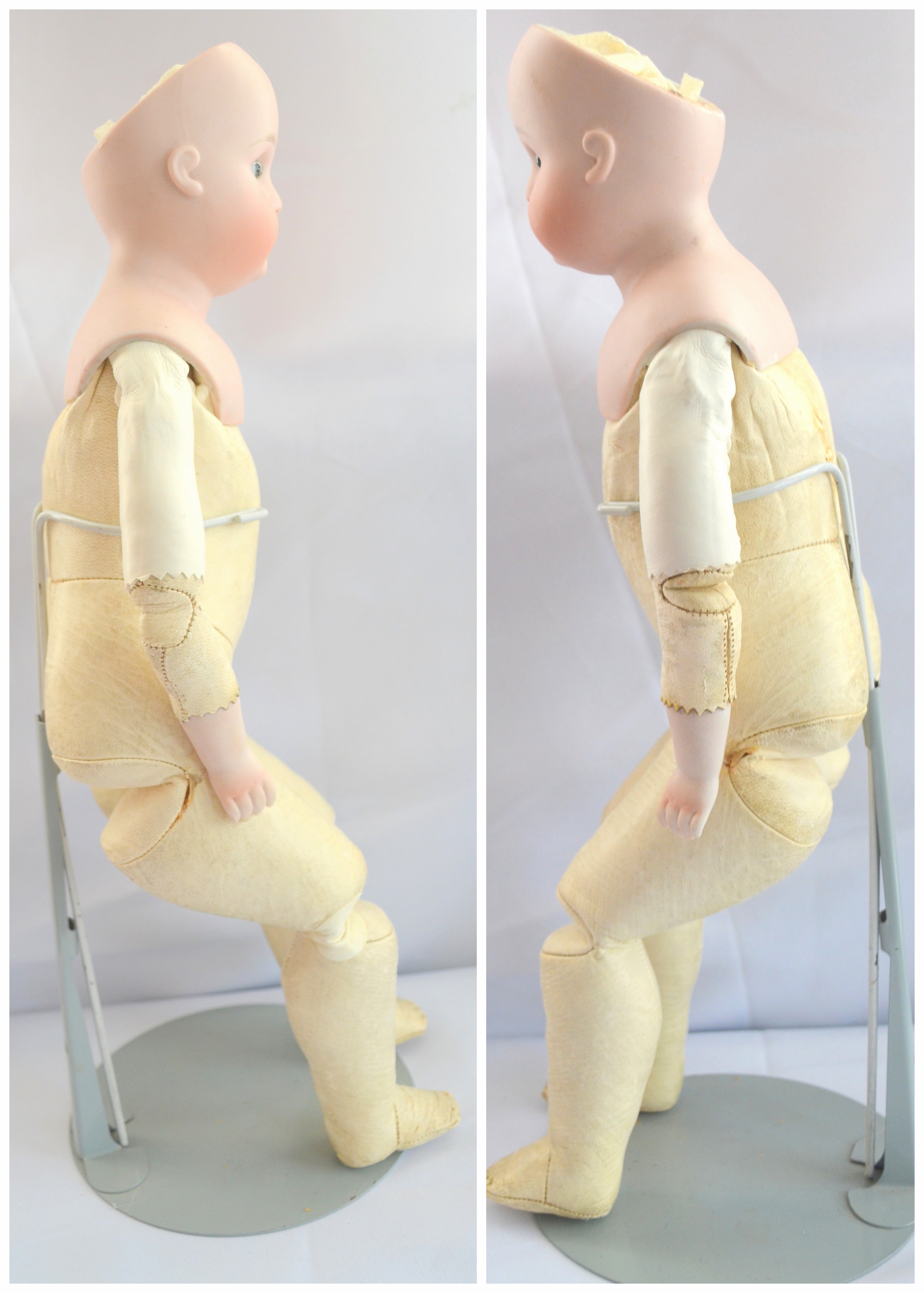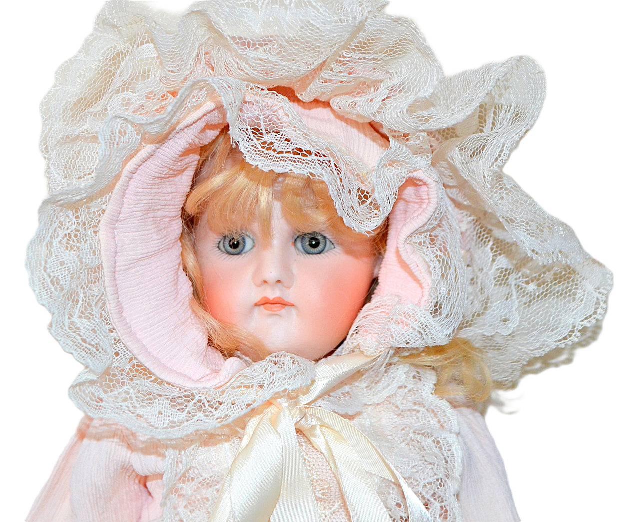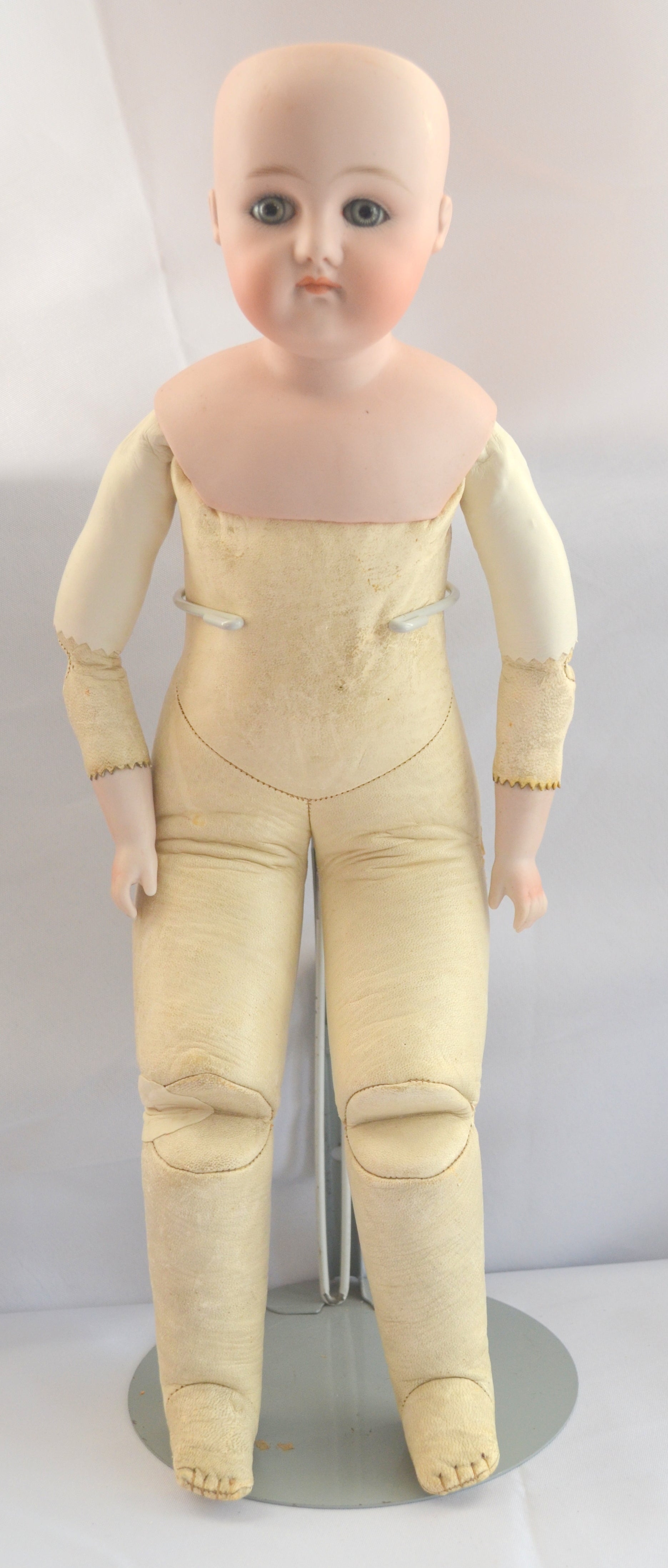 Condition: Doll is in overall Very Good to Excellent Condition. Head is free of hairlines, cracks, chips, or any damage. eyes are clear and without damage, all paint is intact and shows no wear. Her right hand fingers are sheared off at the ends and one finger on her left hand has been repaired, she has leather reinforced to gusset of each upper shoulder/arm area otherwise the leather is fine. Blonde mohair wig appears to be original and is good, outfit is a replaced vintage dress.