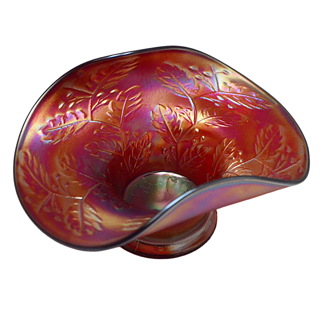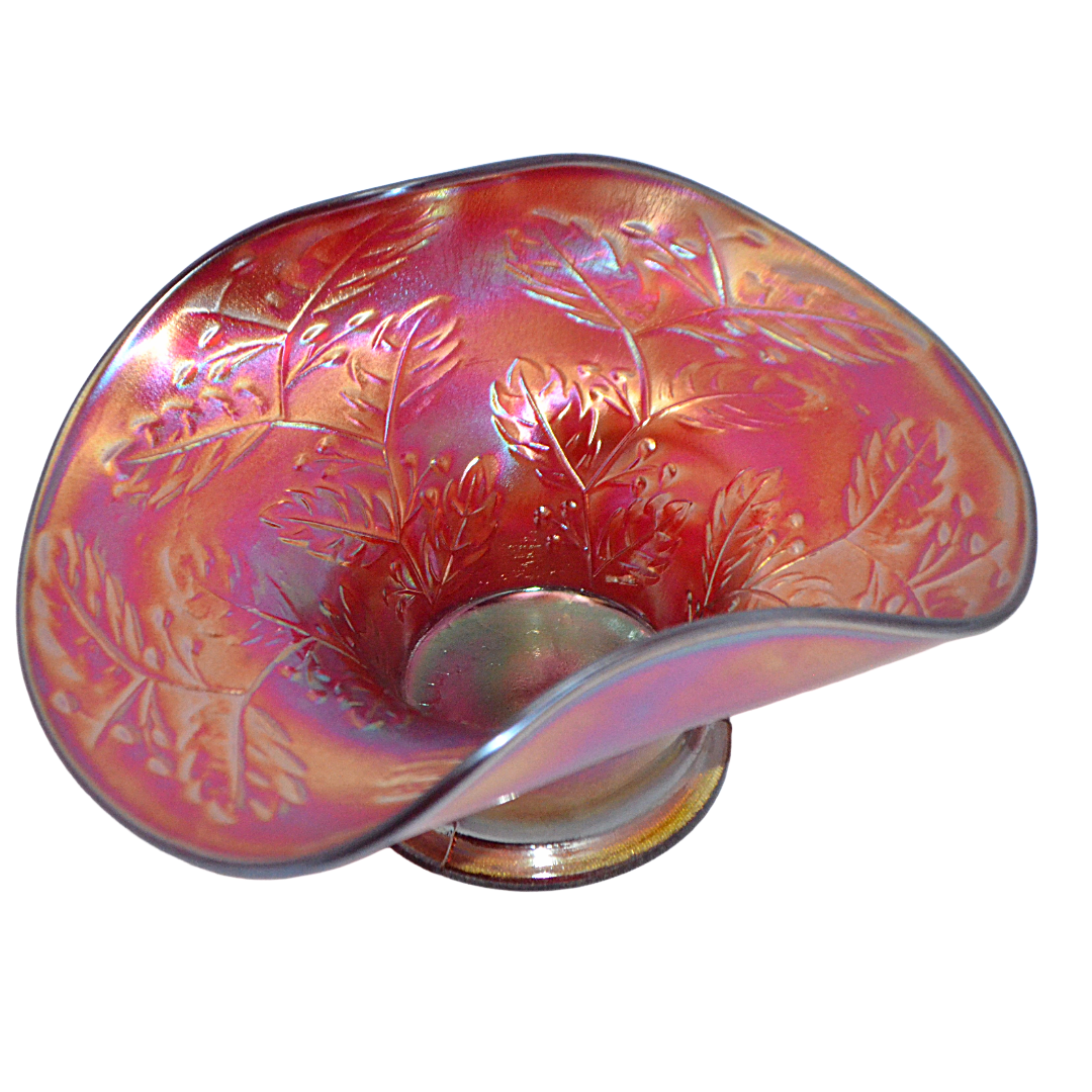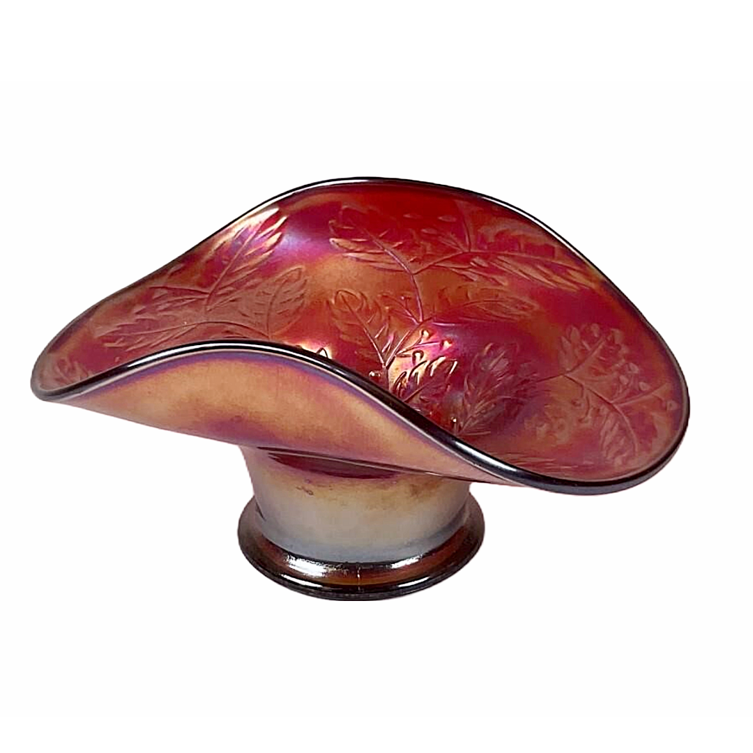 Picture this: a showstopping Fenton carnival glass hat vase that's basically a color-shifting work of art! This cherry red beauty features the iconic Holly branch design and flaunts that mesmerizing two-sides-up silhouette. The iridescent finish dances with jewel-toned brilliance under any light—natural or otherwise—making it an absolute head-turner for collectors. Rare, radiant, and ridiculously gorgeous, this piece of Fenton glass deserves a spot where everyone can admire its shimmering charm.
