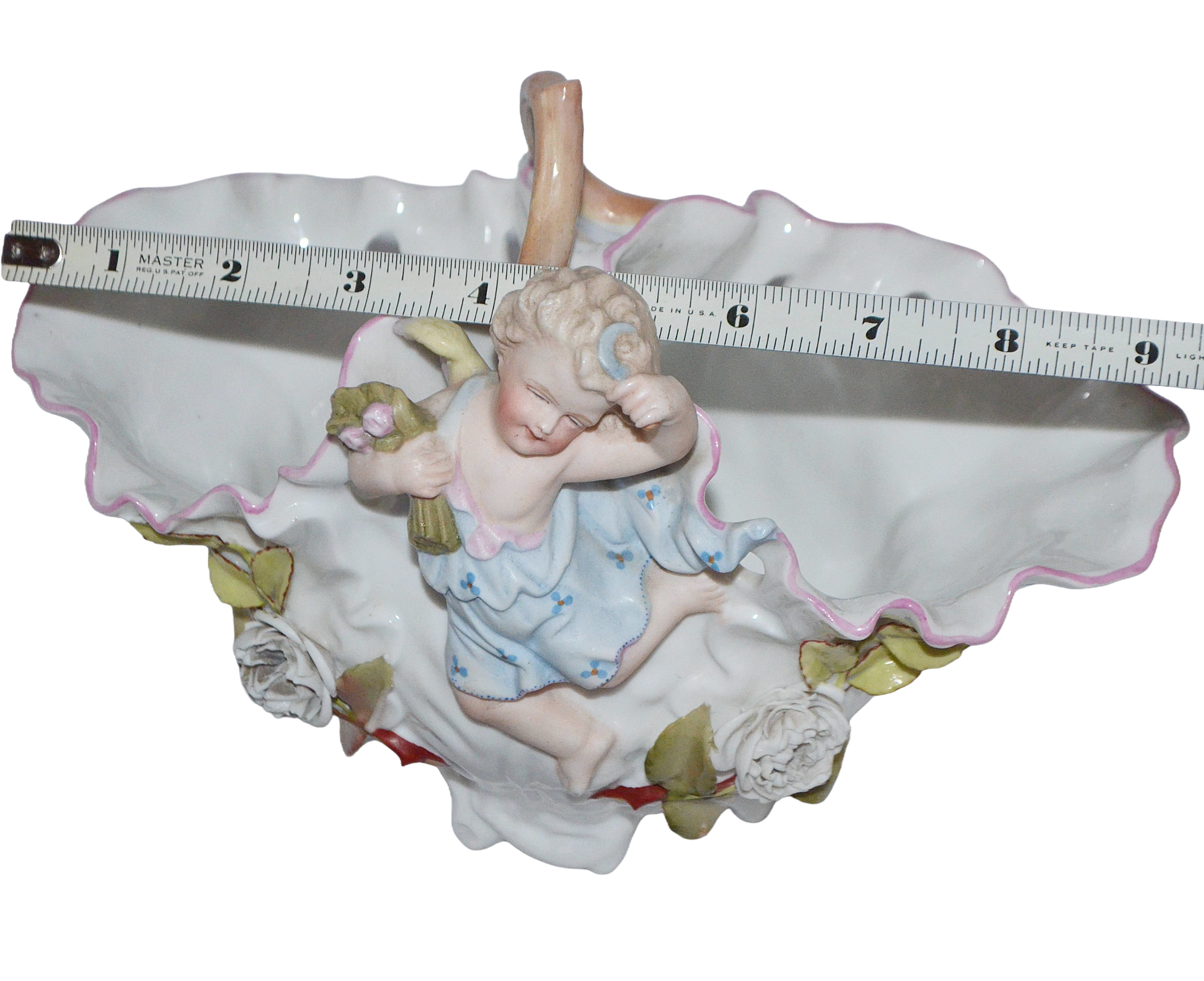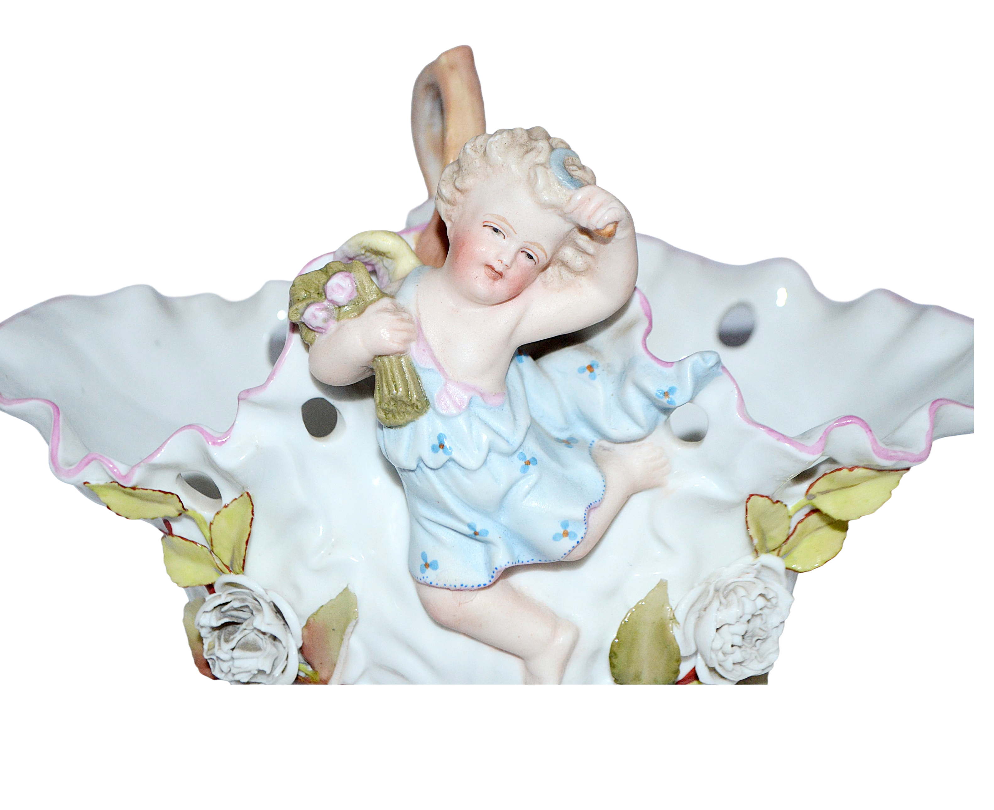Elevate your collection with this stunning Sitzendorf porcelain basket, a remarkable testament to Victorian artistry and refinement. Hand-painted with exquisite detail, it showcases a charming cherub figure enveloped by lavishly sculpted porcelain flowers and foliage in the ornate Rococo tradition. This generously proportioned piece, dating from the late 1800s, commands attention as a sophisticated decorative treasure. The masterful craftsmanship and authentic period styling make it an essential acquisition for collectors who appreciate the enduring elegance and historical significance of fine European porcelain.. Impressed with numbers "7087? X" bottom rim, also impressed "Depose" with the early Sitzendorf line mark in blue underglaze.