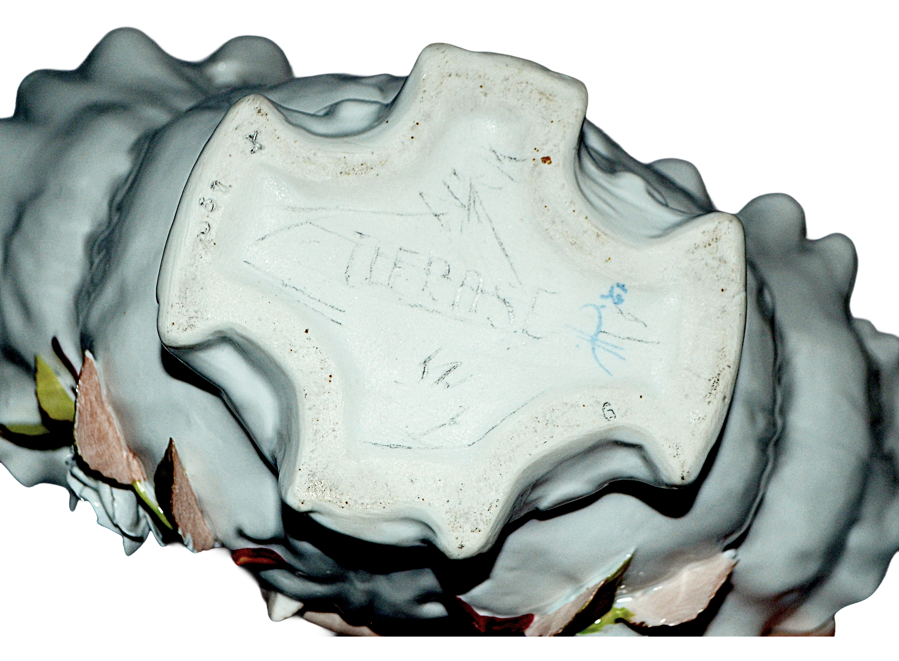 Basket is excellent with no chips, cracks, or repairs, flowers and leaves show minimal wear, we note only a a few tiny flakes to the edges of the leaves and blossoms