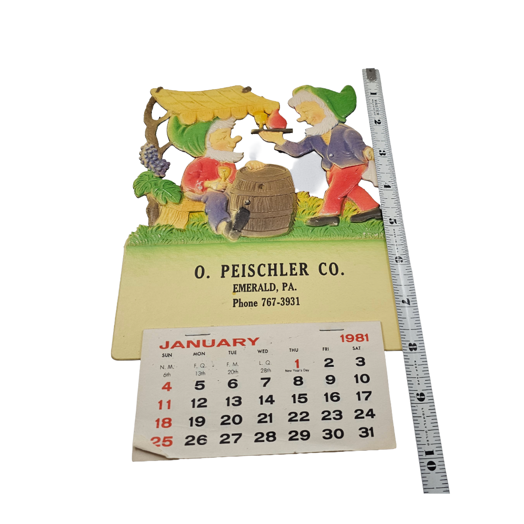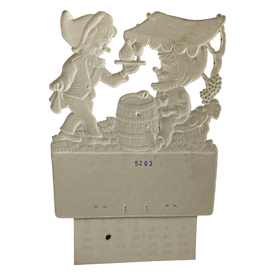 Step into a festive fantasy with this charming 1981 German calendar! This delightfully whimsical die-cut creation features meticulous embossing and pressed paper artistry depicting two merry elves in a moment of pure joy. One cheerful elf presents a bottle and glass of wine to a companion lounging contentedly at a barrel beneath a cozy canopy. Brimming with Old World character and holiday spirit, this complete vintage treasure is perfect for collectors who appreciate playful craftsmanship and nostalgic seasonal magic.