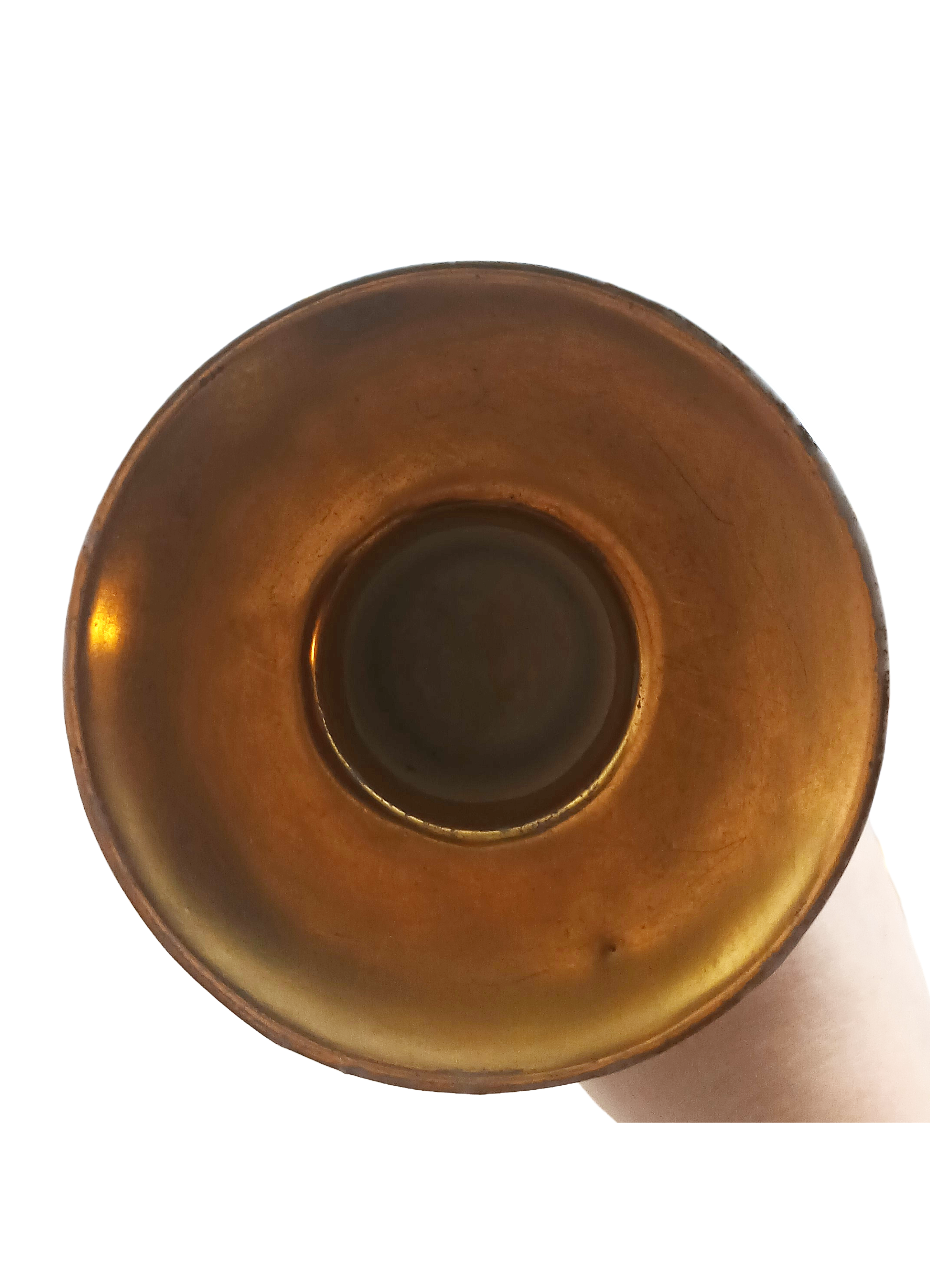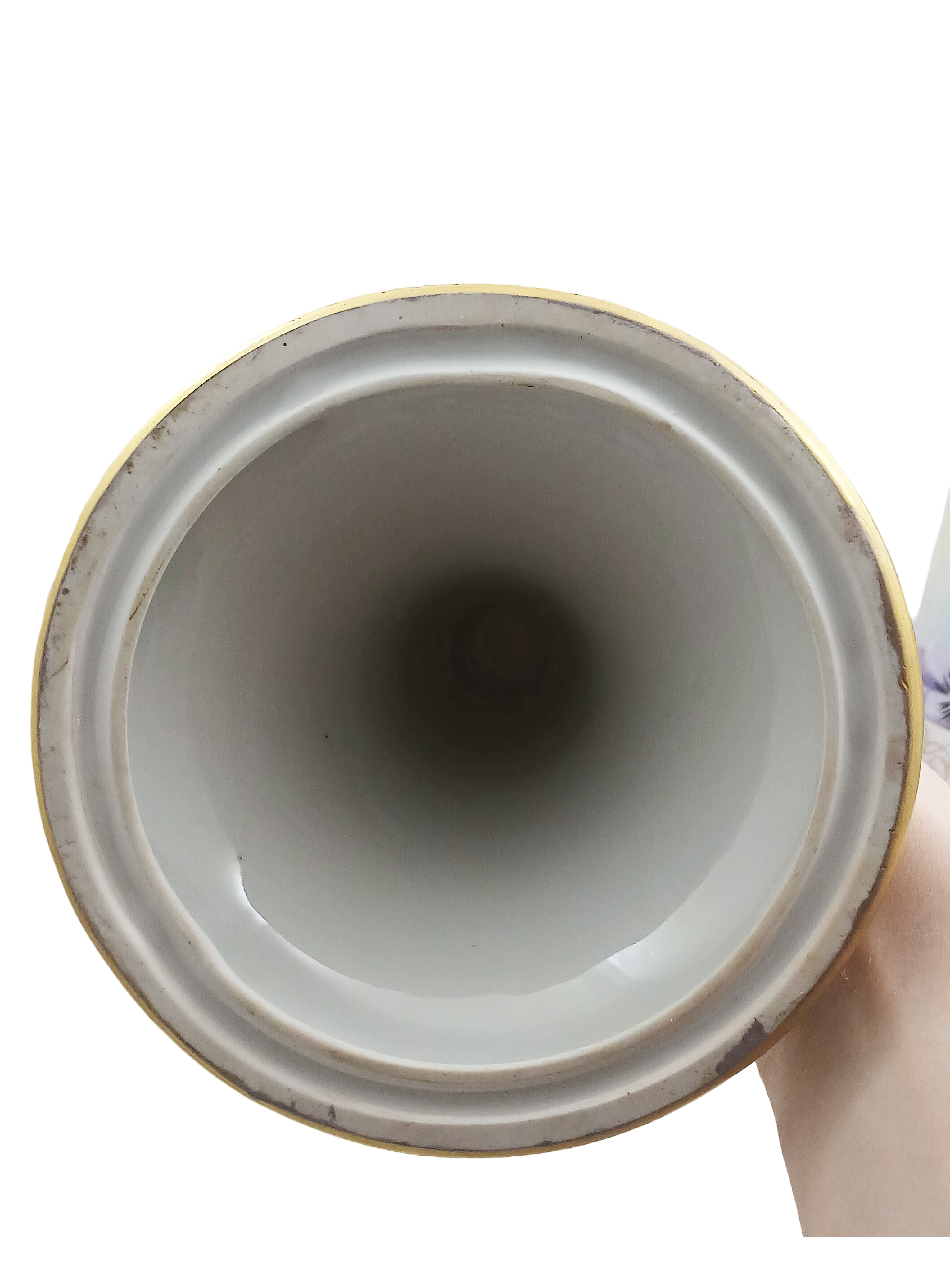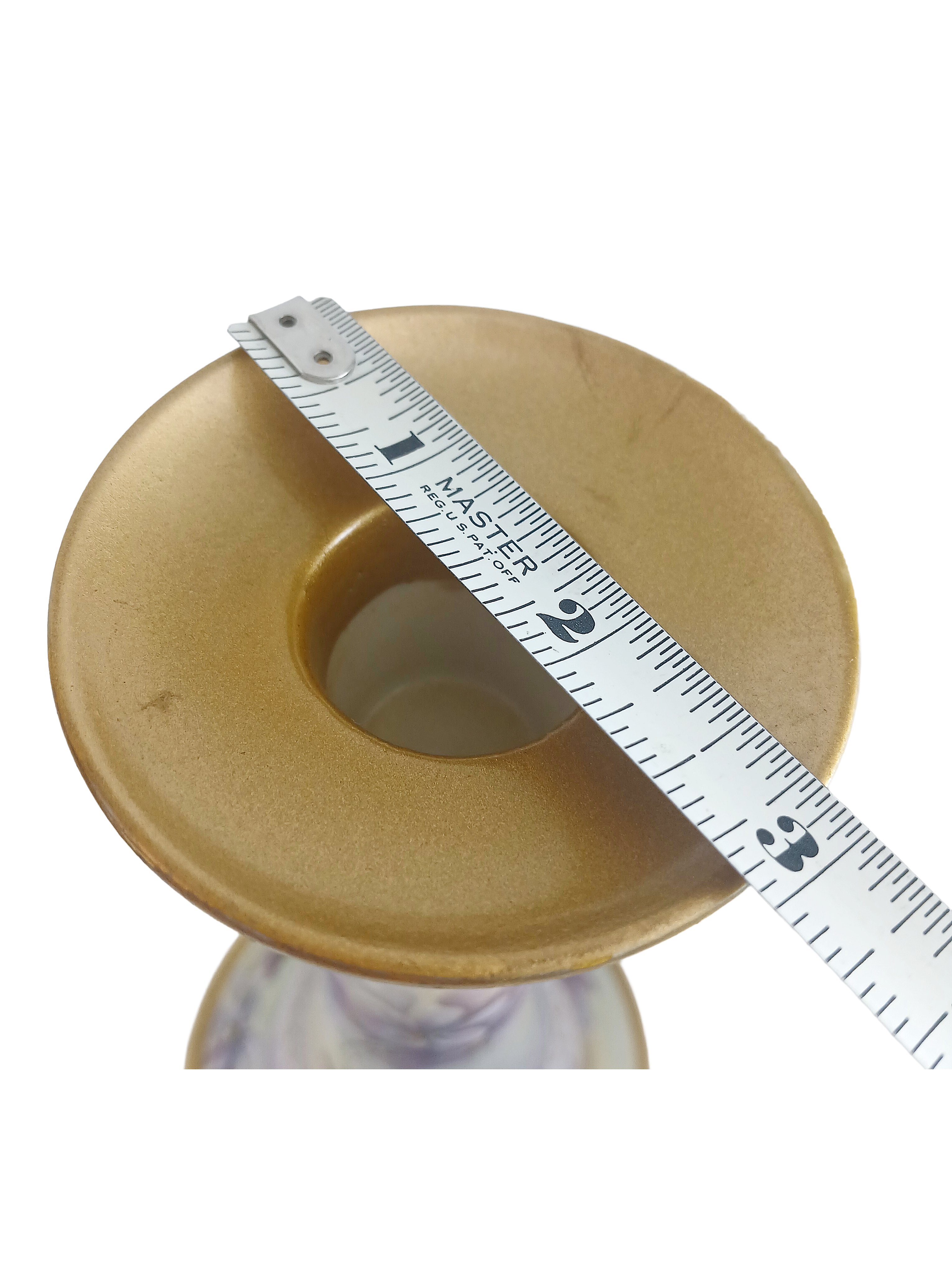 This exquisite pair of porcelain candlestick holders showcases the refined artistry of Margaret Perl, a celebrated California porcelain painter from the early 20th century. Each piece features delicate hand-painted violets in rich purples, blues, and lavenders that dance across creamy white surfaces, complemented by elegant gold trim along the edges and top. The gold-etched floral details add an extra layer of sophistication to these already stunning vessels. Crafted on what appears to be a Limoges blank—a testament to the quality materials Perl selected for her work—these candlesticks represent a beautiful moment in American decorative arts history when talented artists like Perl brought their individual vision to fine porcelain. A wonderful addition for collectors who appreciate authentic, handcrafted vintage pieces with documented artistic provenance.