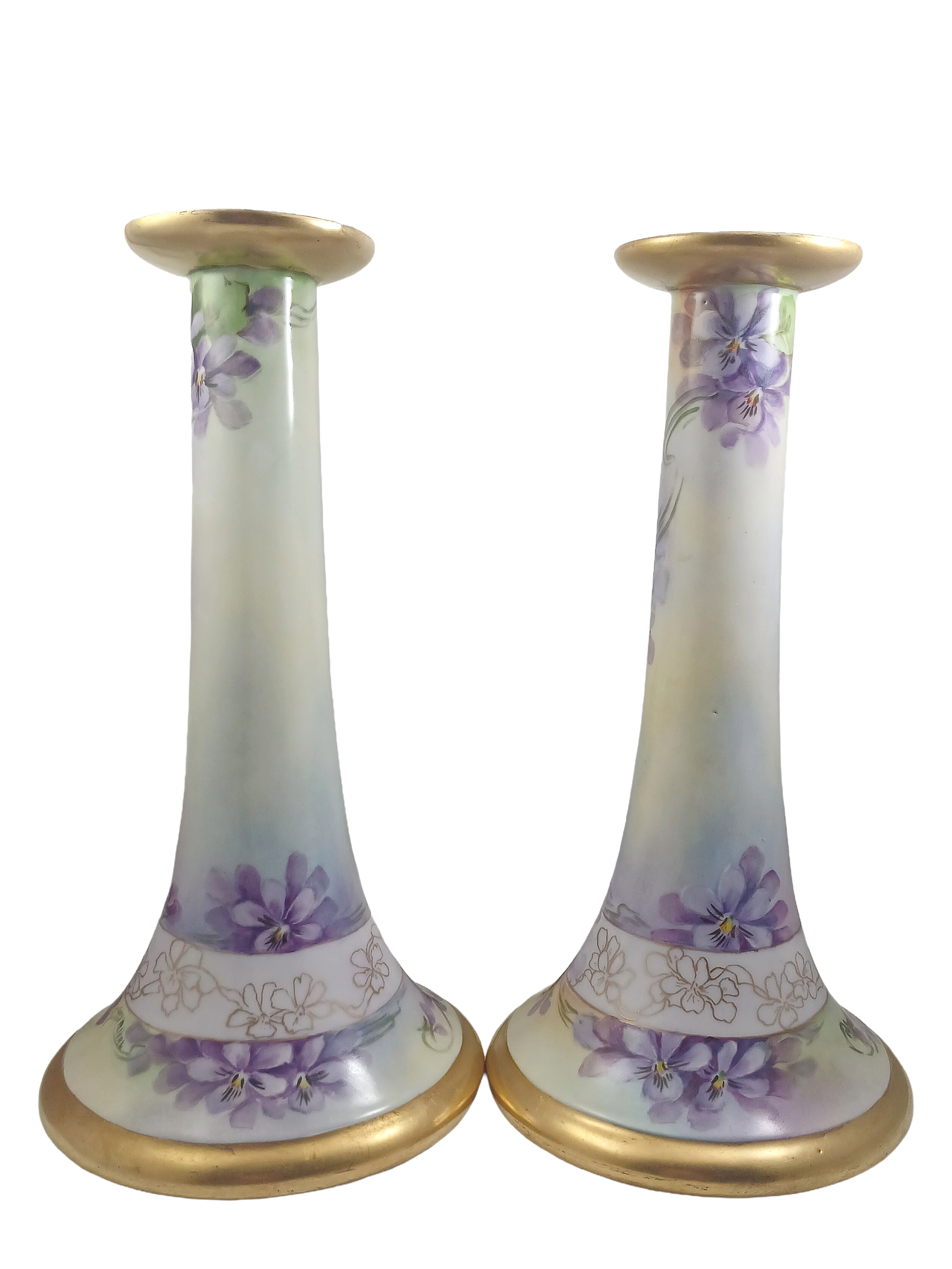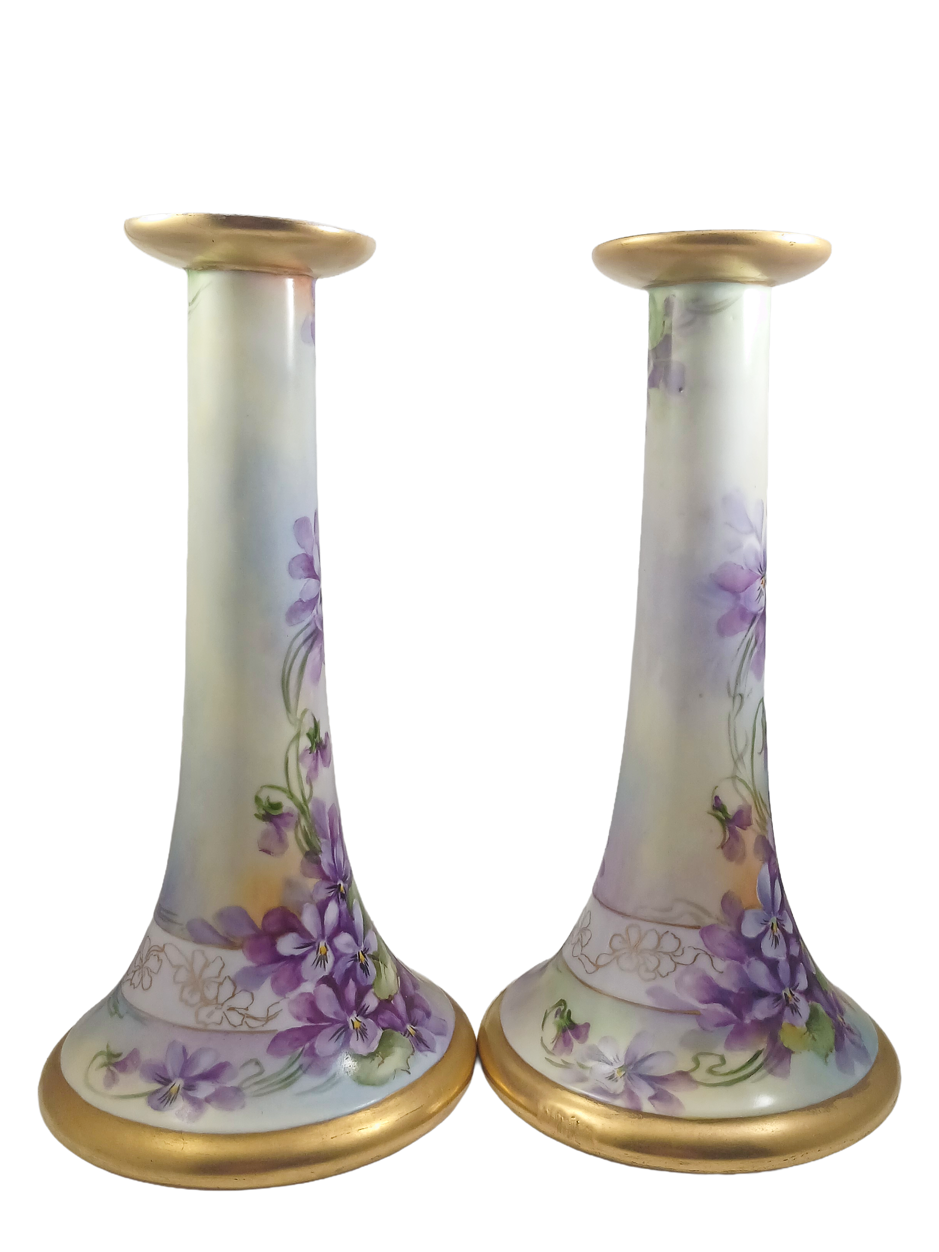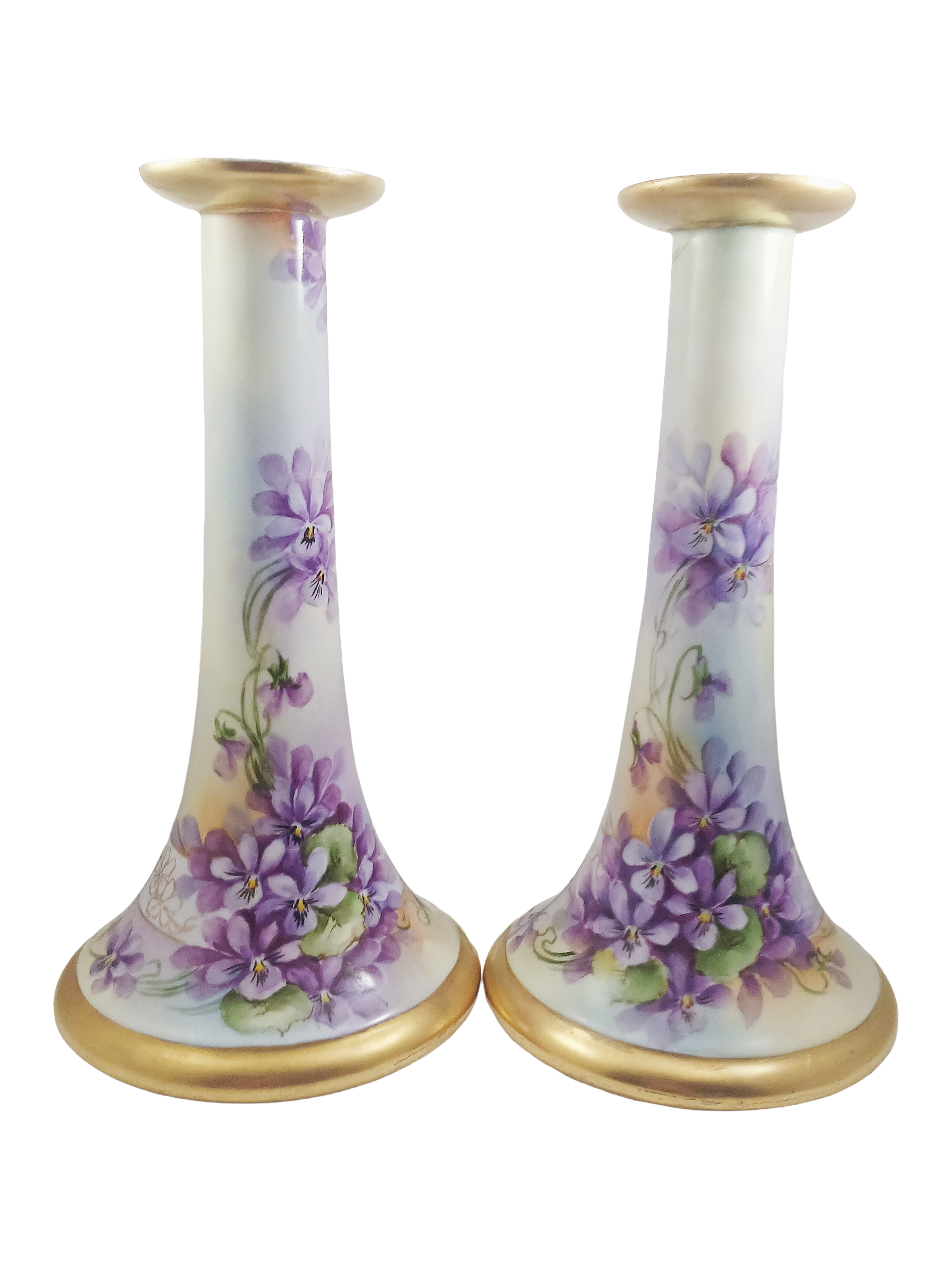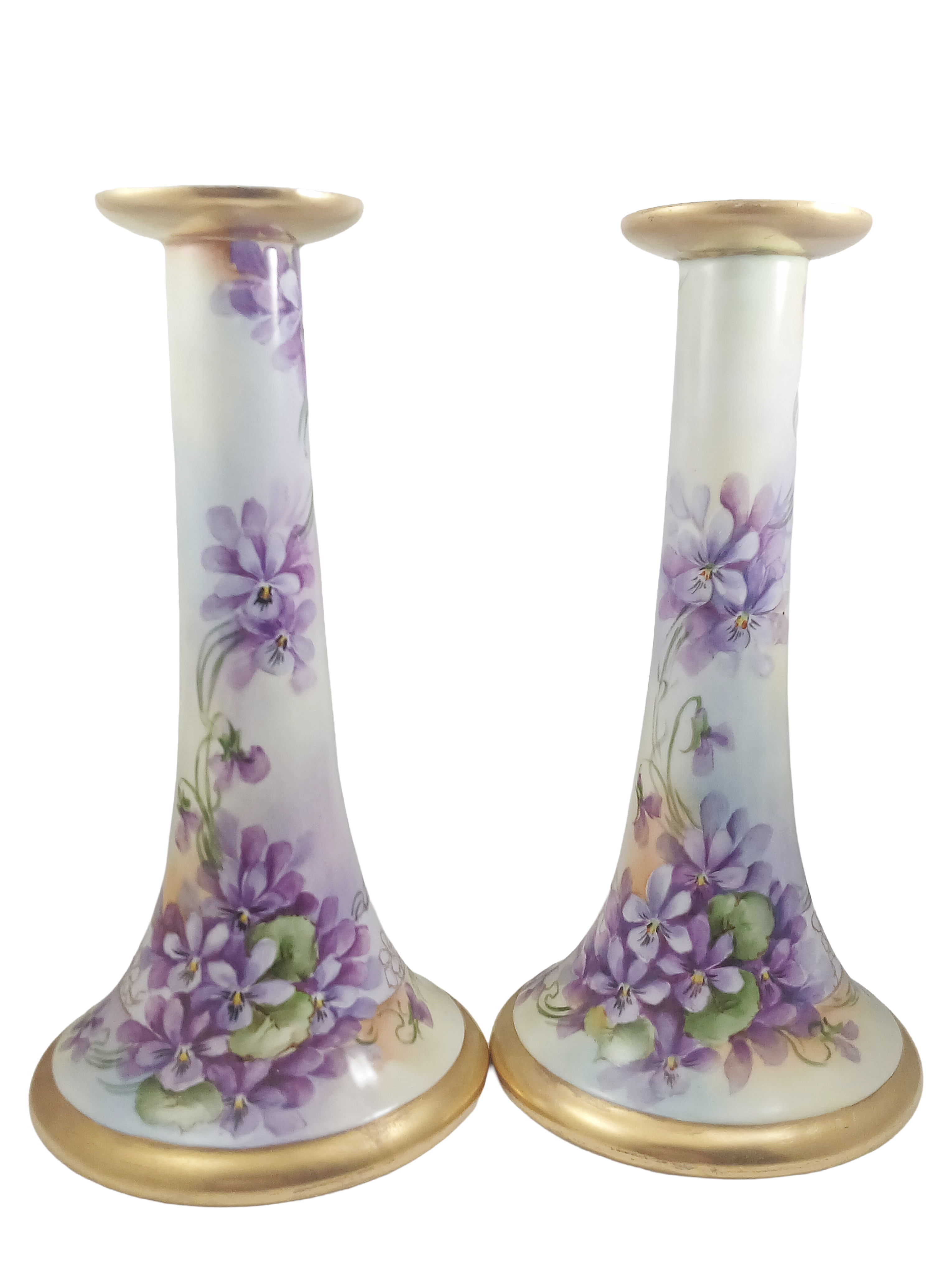 Limoges Porcelain Candle Holders Hand Painted Violets Artist Signed Perl