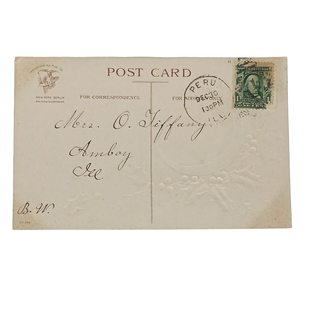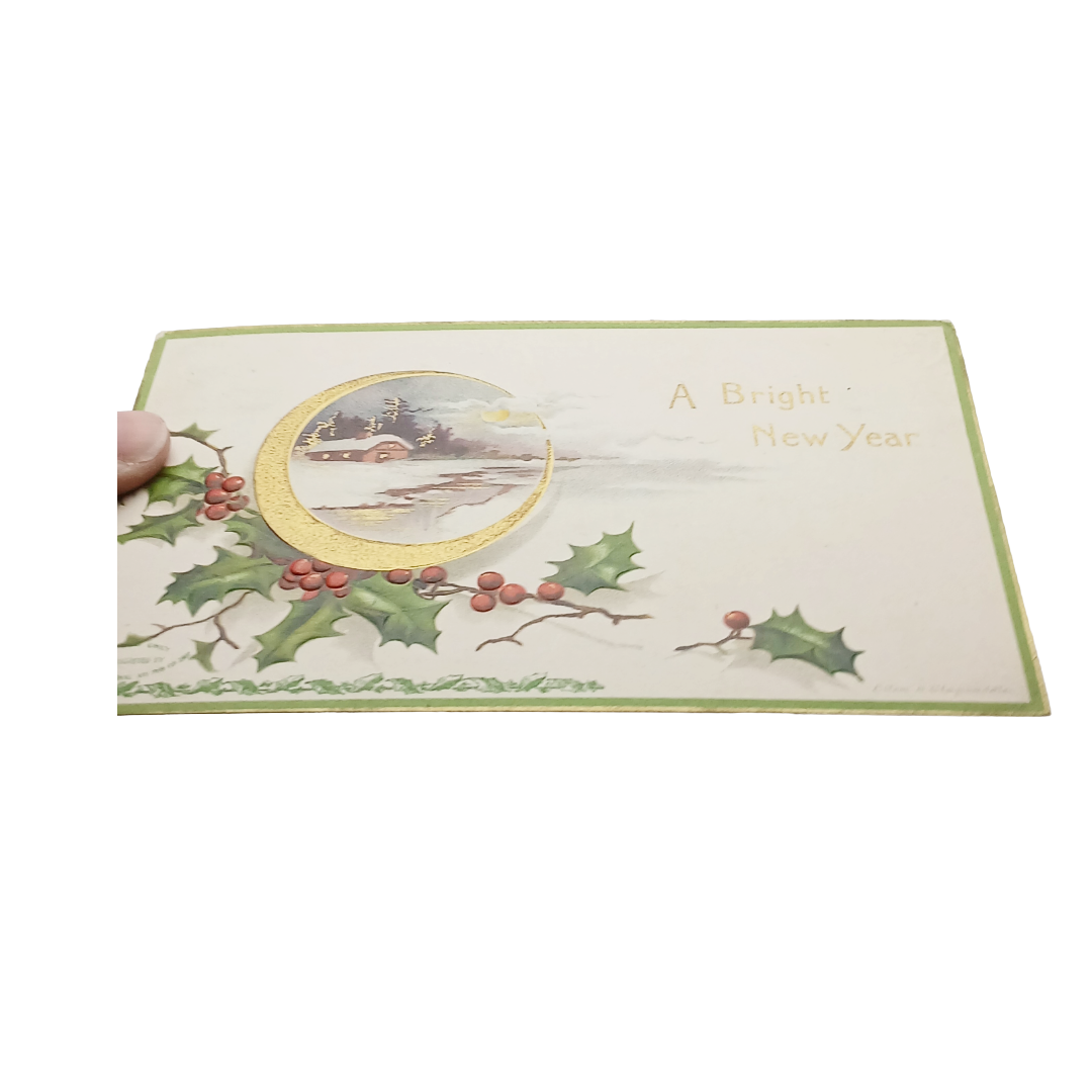 New Year Postcard Clapsaddle House In Snowy Forest Mistletoe Edge Green Border